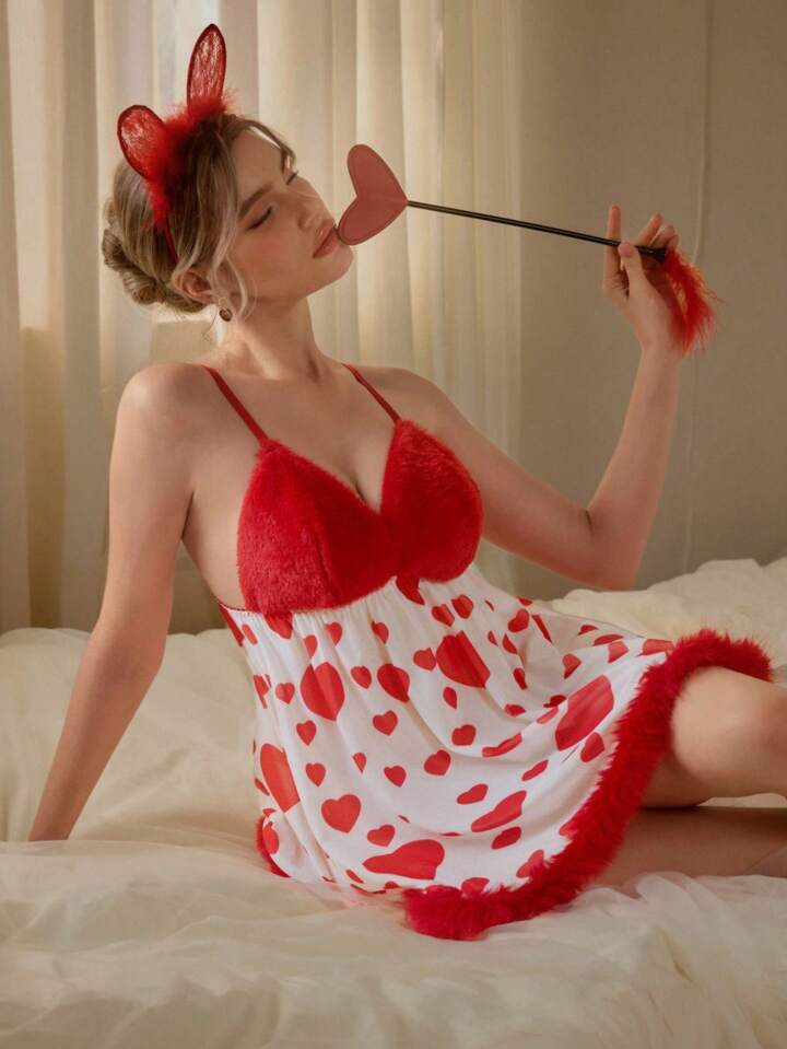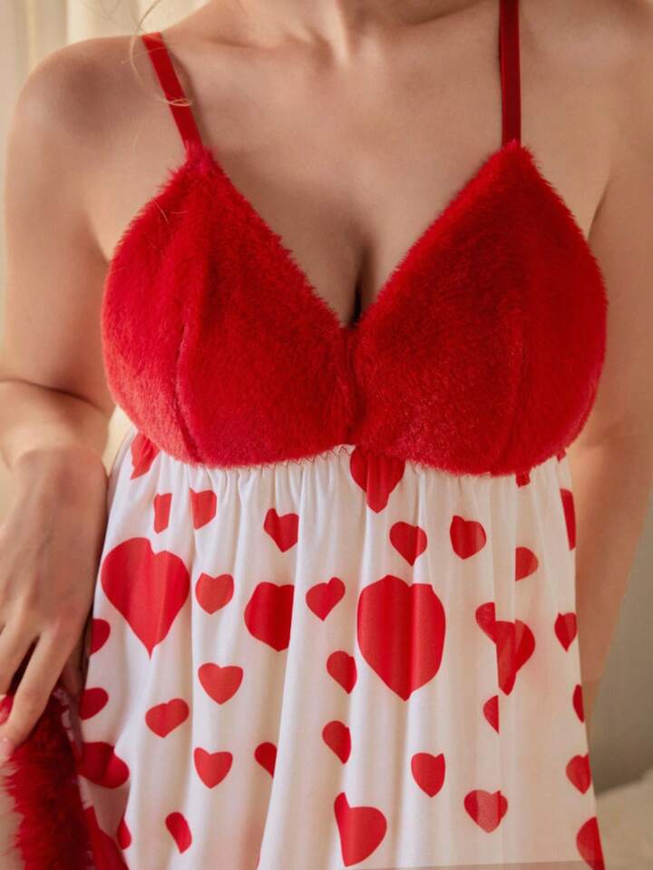 Kawaii Cute & Sexy Heart Pattern Plush Nightgown, Suitable For Valentine's Day