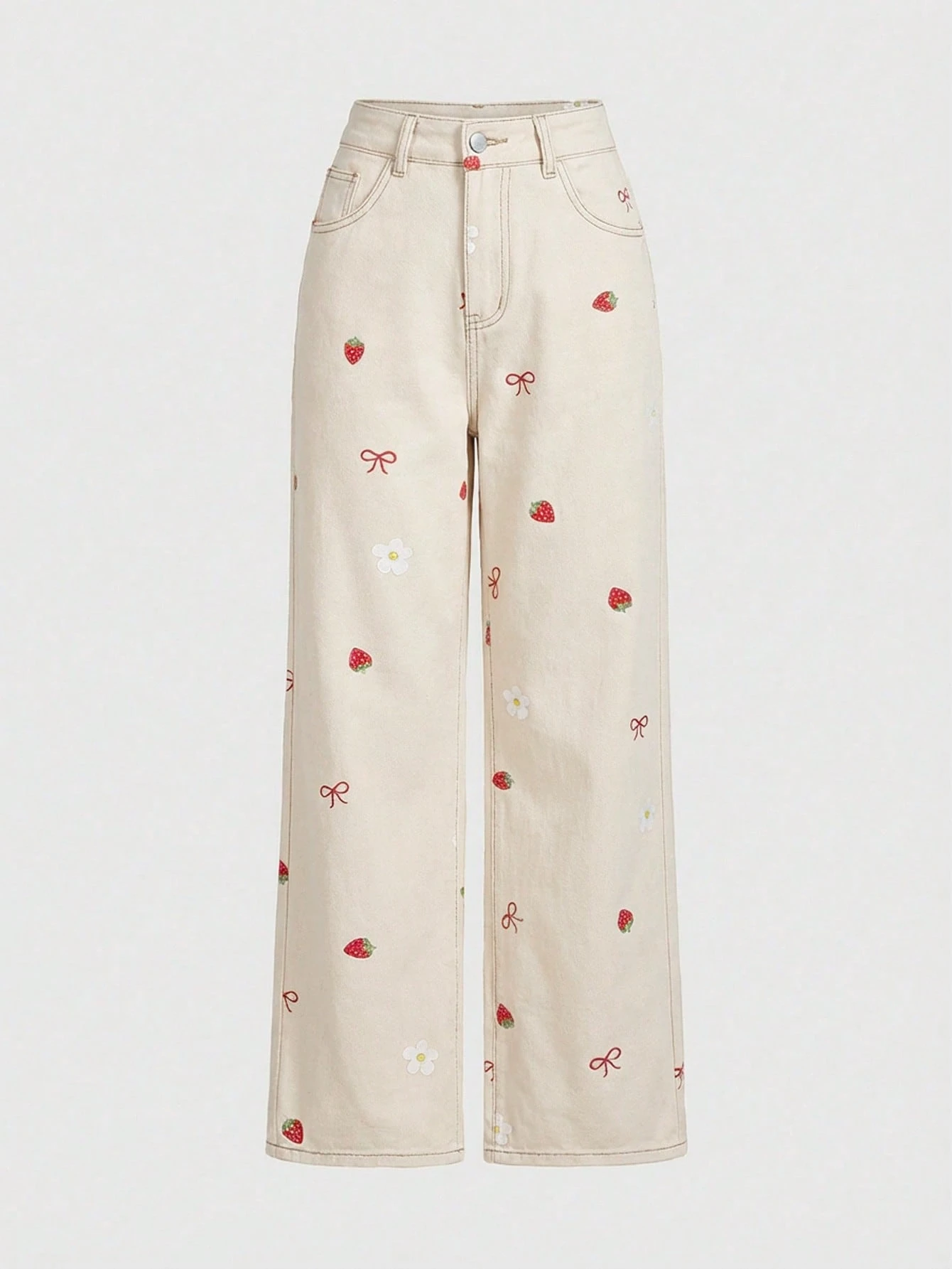 Kawaii Cute Strawberry, Floral And Bow Print Pattern Women's Denim Jeans, Spring/Summer