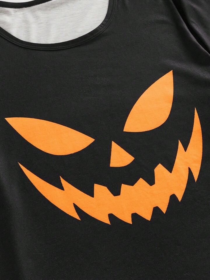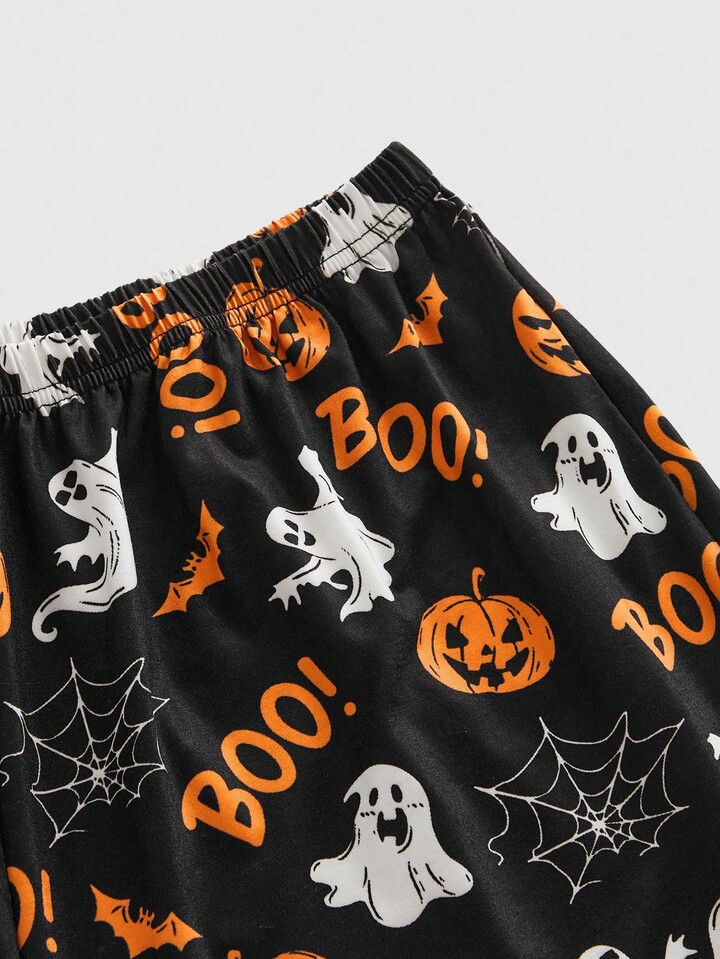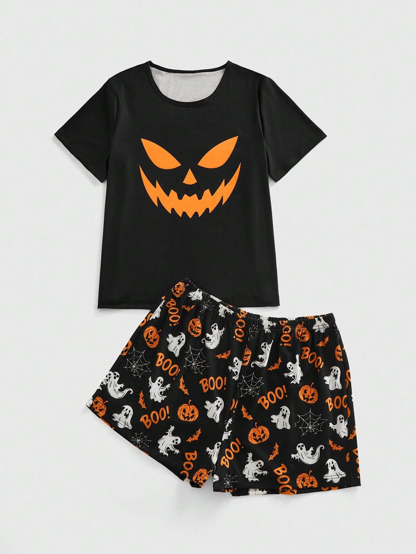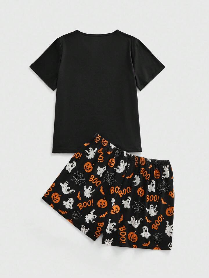 Kawaii Dark Halloween Haunted Spider Web Print Casual Short Sleeve Plus Size Pajama Set