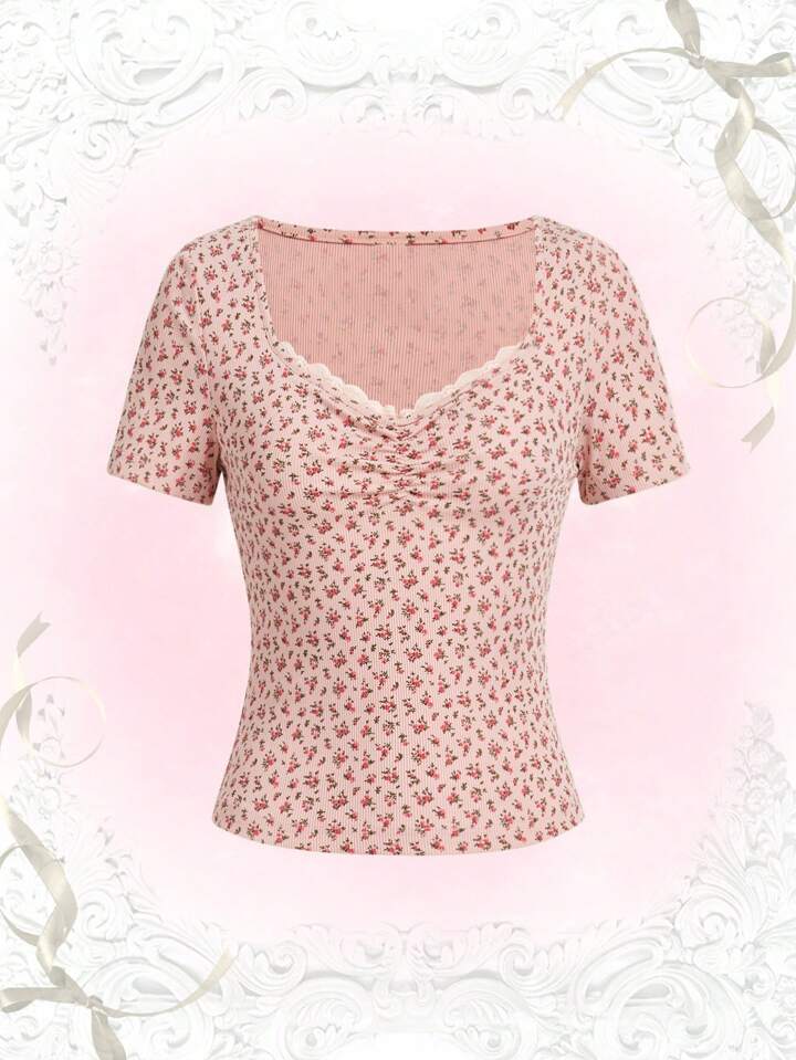 Kawaii Ditsy Floral Print Lace Trim Tee