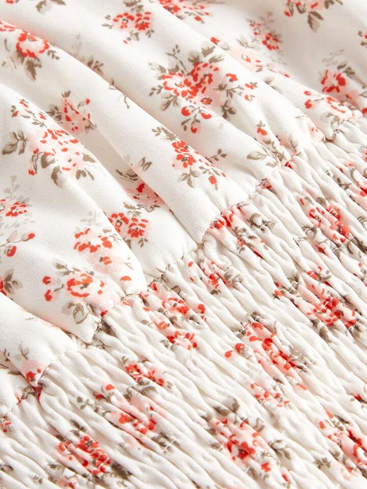 Kawaii Floral Print Lace Up Front Lantern Sleeve Blouse