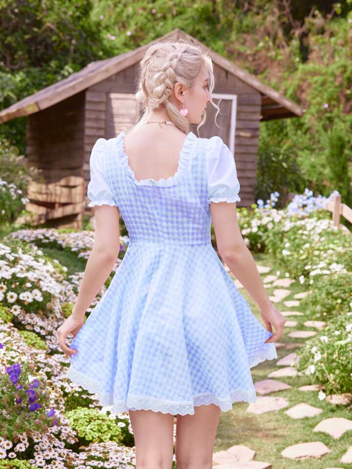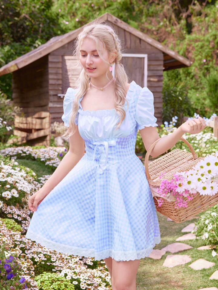 Kawaii Gingham Lace Up Ruched Bust Dress