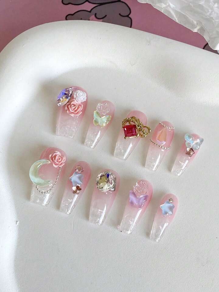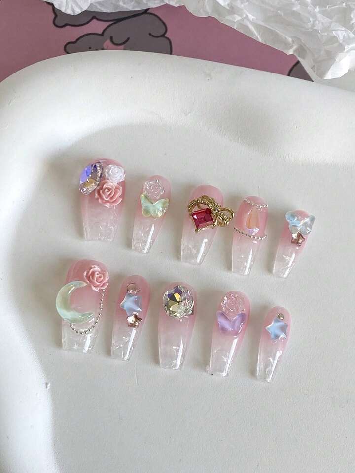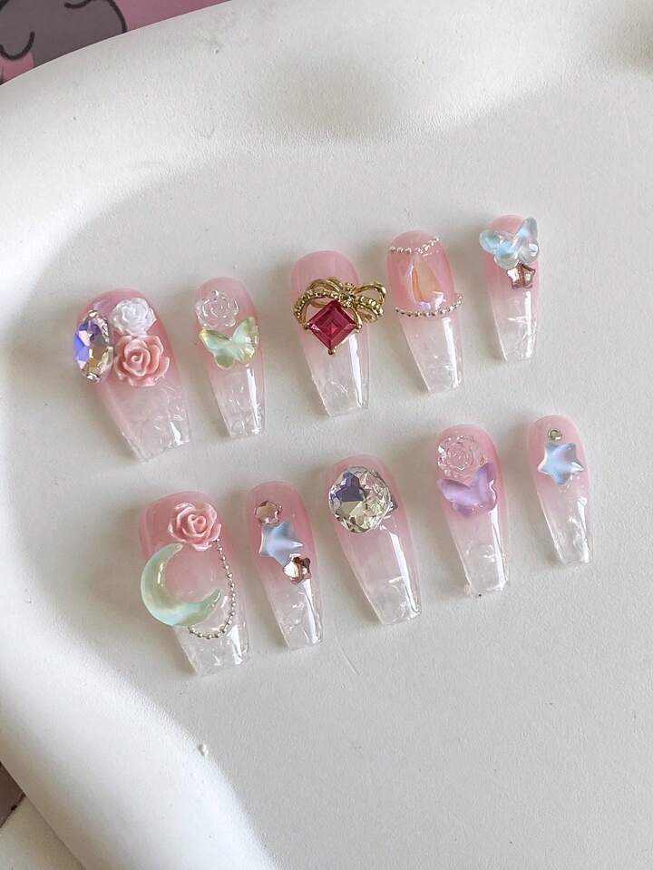 Kawaii (In-Stock) 10pcs Long Peach Colored Glass Fake Nails With Jelly Glue