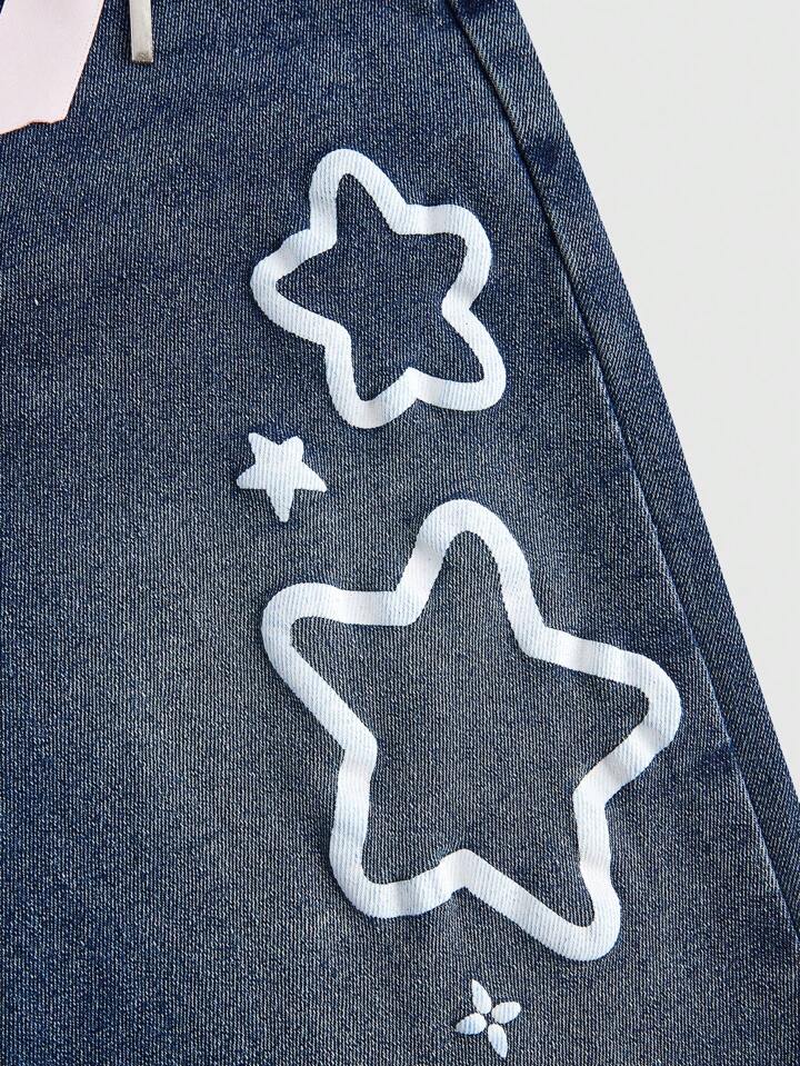 Kawaii Japanese Himekaji Sweet And Cute Bowknot With Cross Pendant, Starry Printed Flared Jeans With Lace Up, School