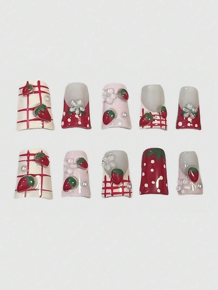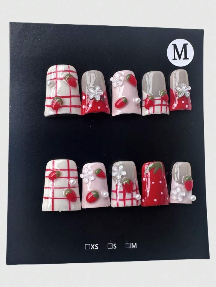 Kawaii Y2K Sweet Cute Pink Strawberry Romantic Plaid, Polka Dot, Floral, French Tip Fake Nails, Handmade, Suitable For Daily Casual Wear And Dates