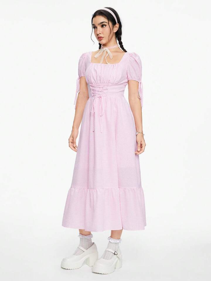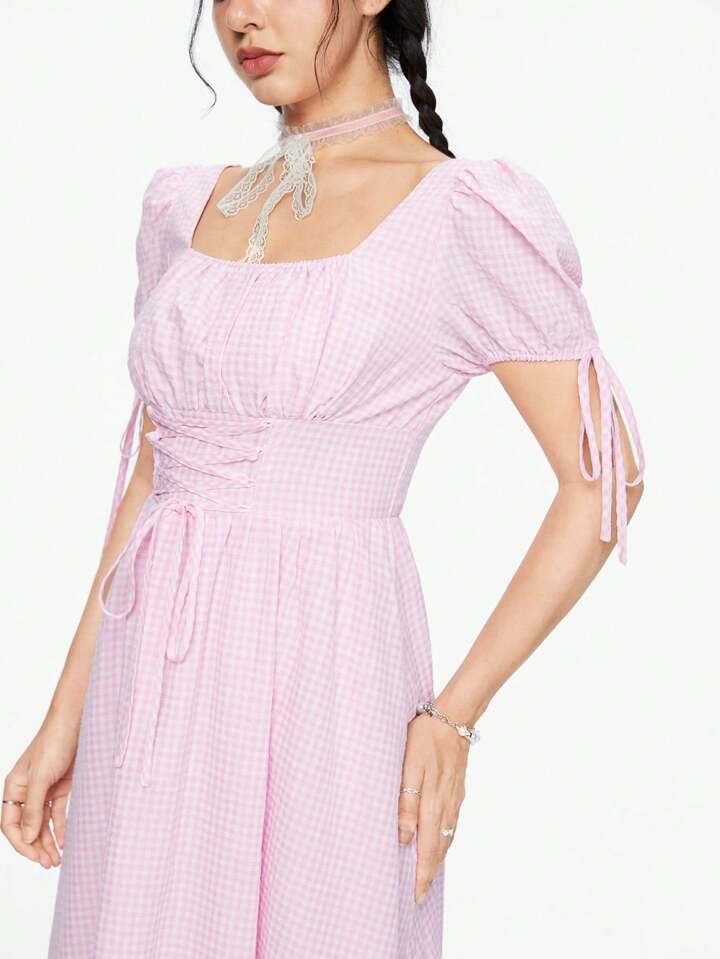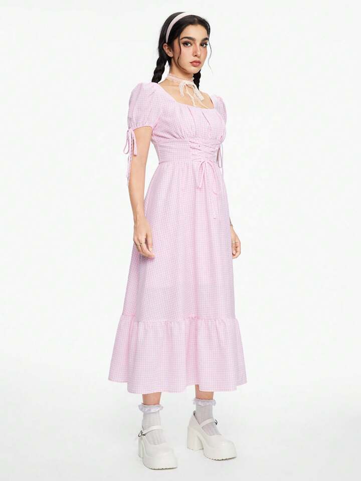 Kawaii Ladies' Summer Plaid Square Collar Long Dress With Short Puff Sleeves And Waist Tie
