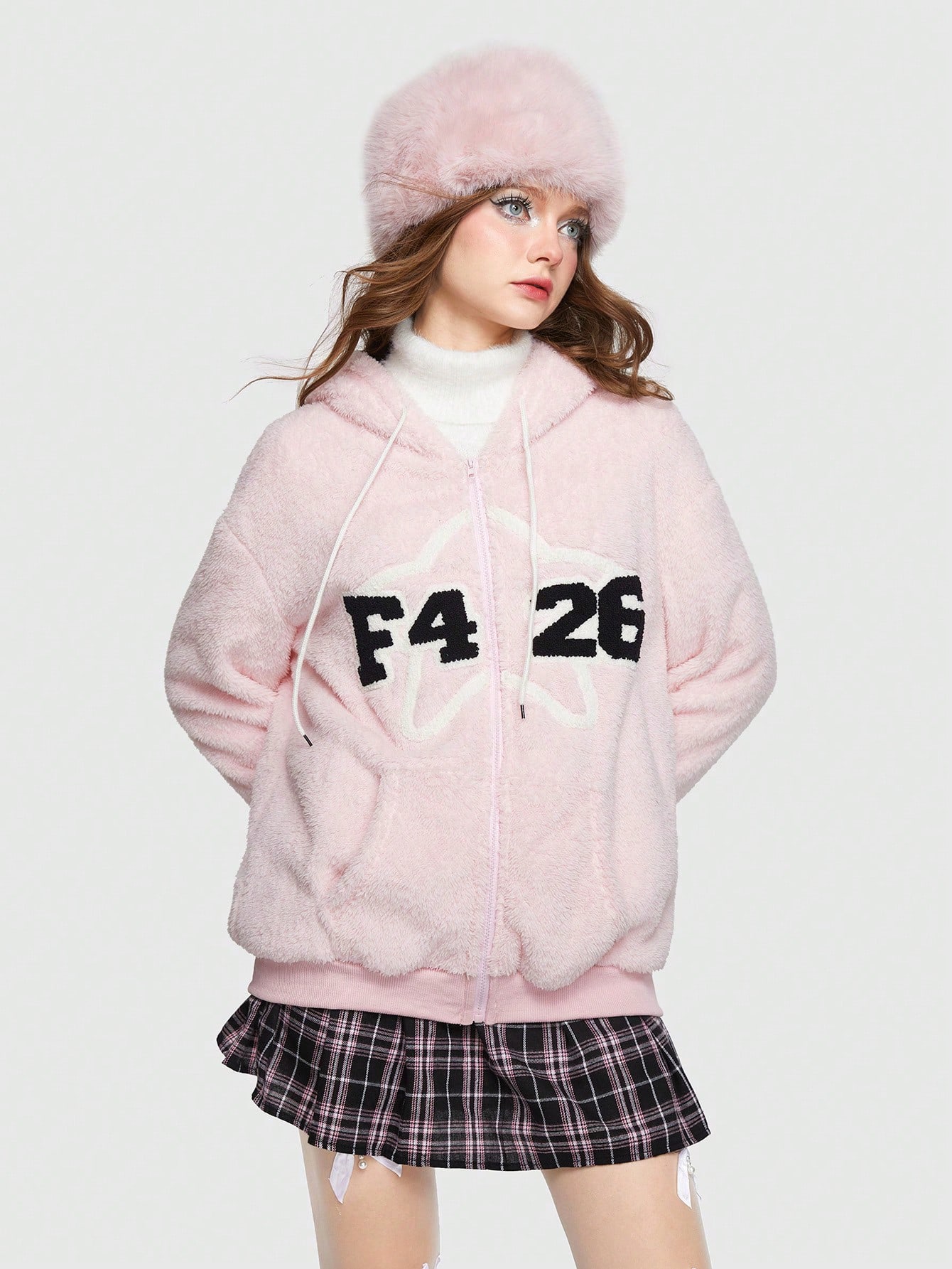 Kawaii Letter Pattern Drop Shoulder Drawstring Hooded Teddy Coat
