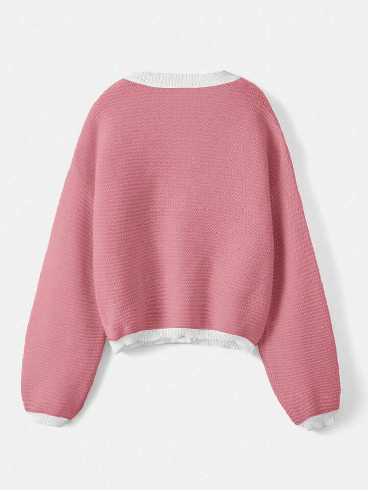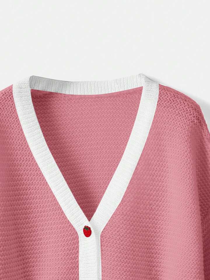 Kawaii Long Sleeve Contrast Stitching Button Front Top With Strawberry Print, Casual Daily Wear