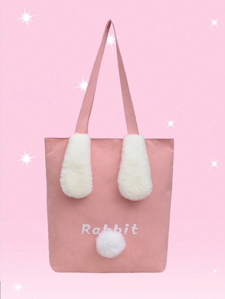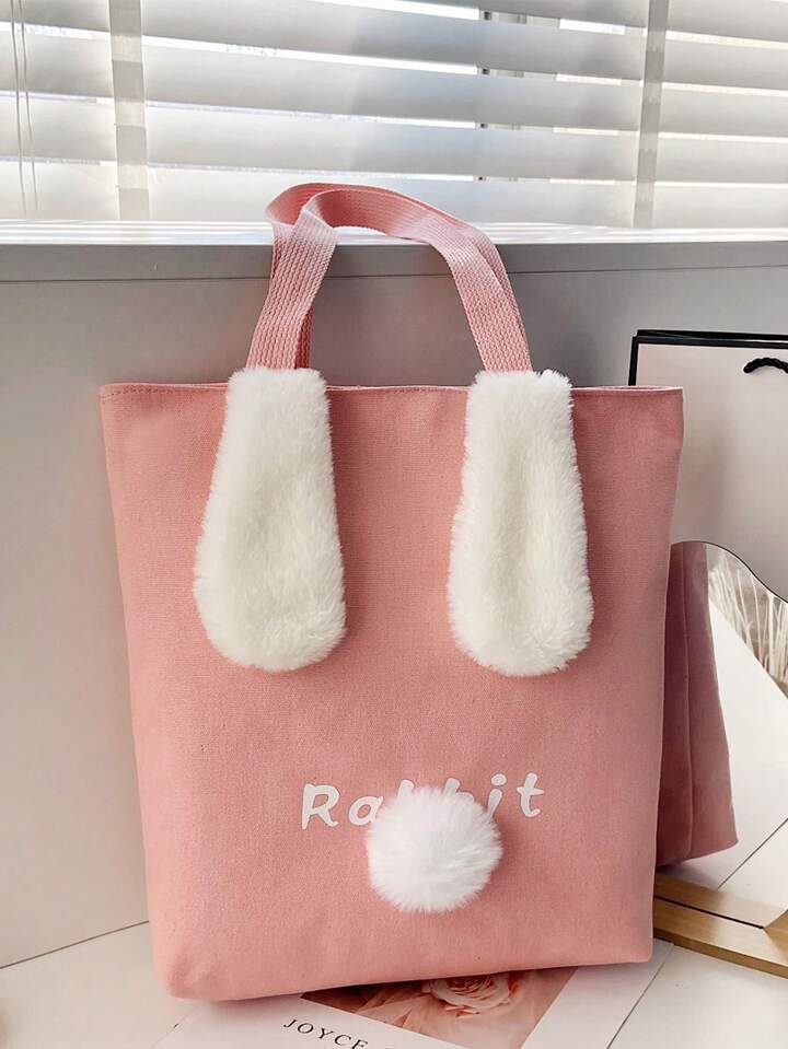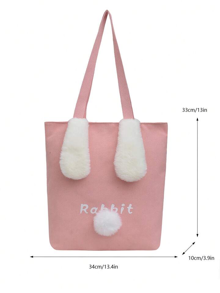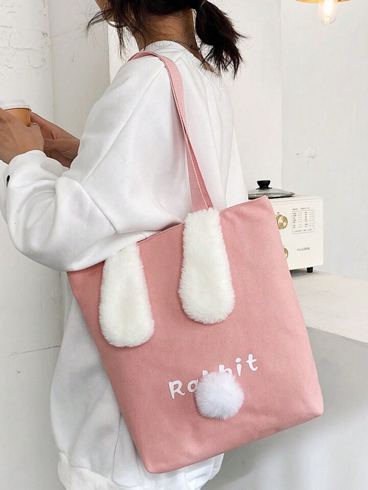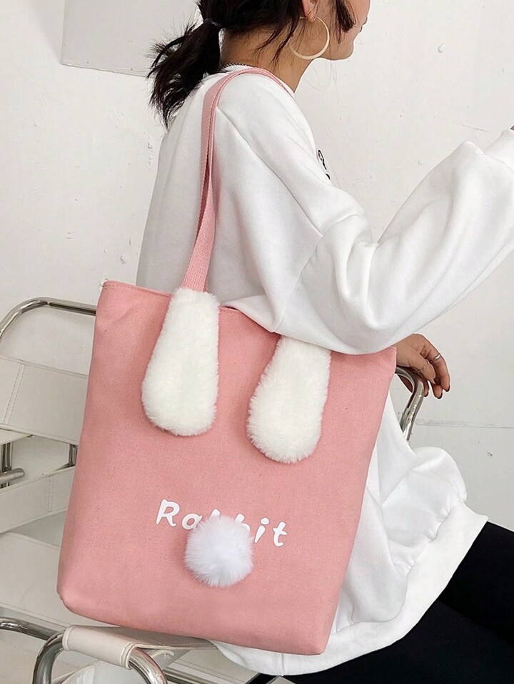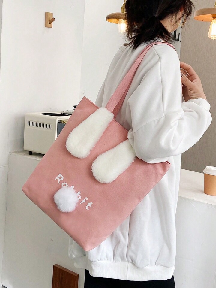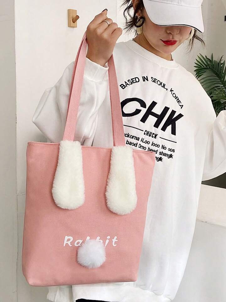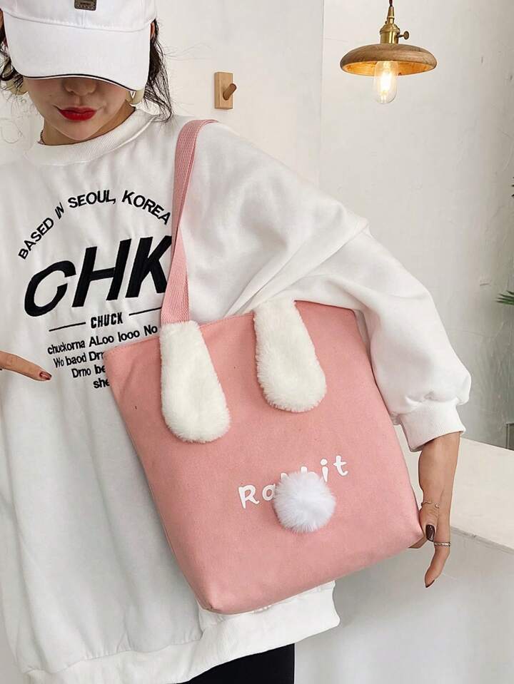 Kawaii Medium Shoulder Tote Bag Cute Letter Graphic Pom Pom Decor For Women For Daily