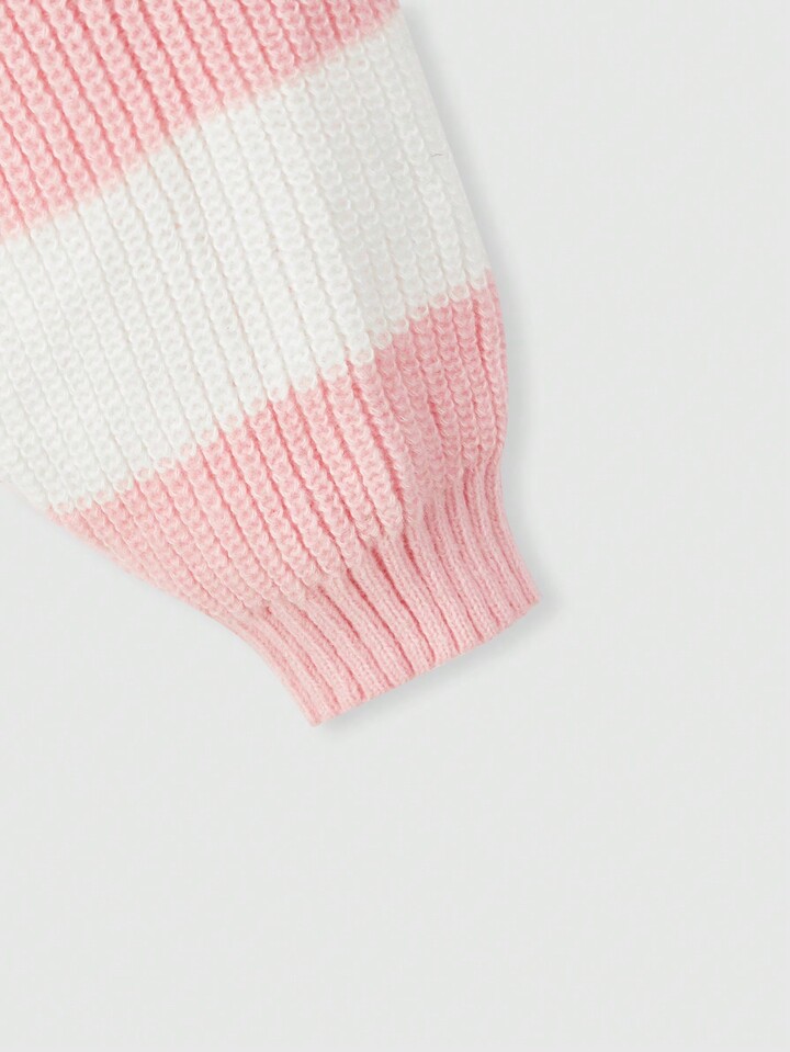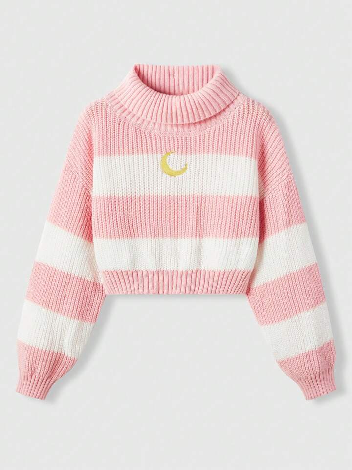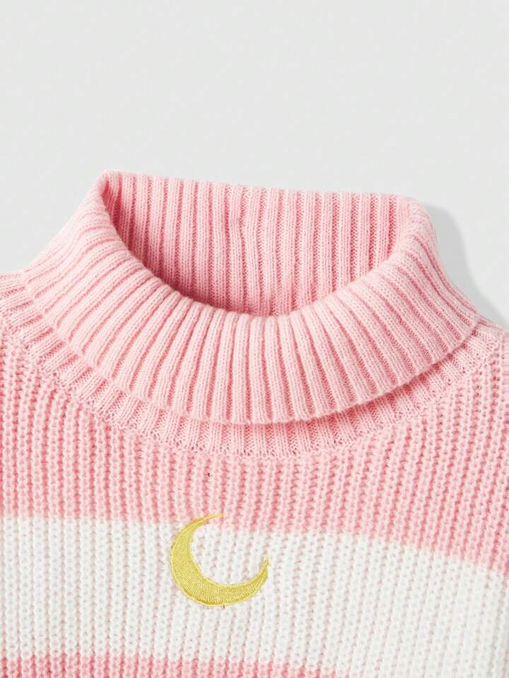 Kawaii Moon Embroidery Striped Pattern Turtleneck Drop Shoulder Sweater, School