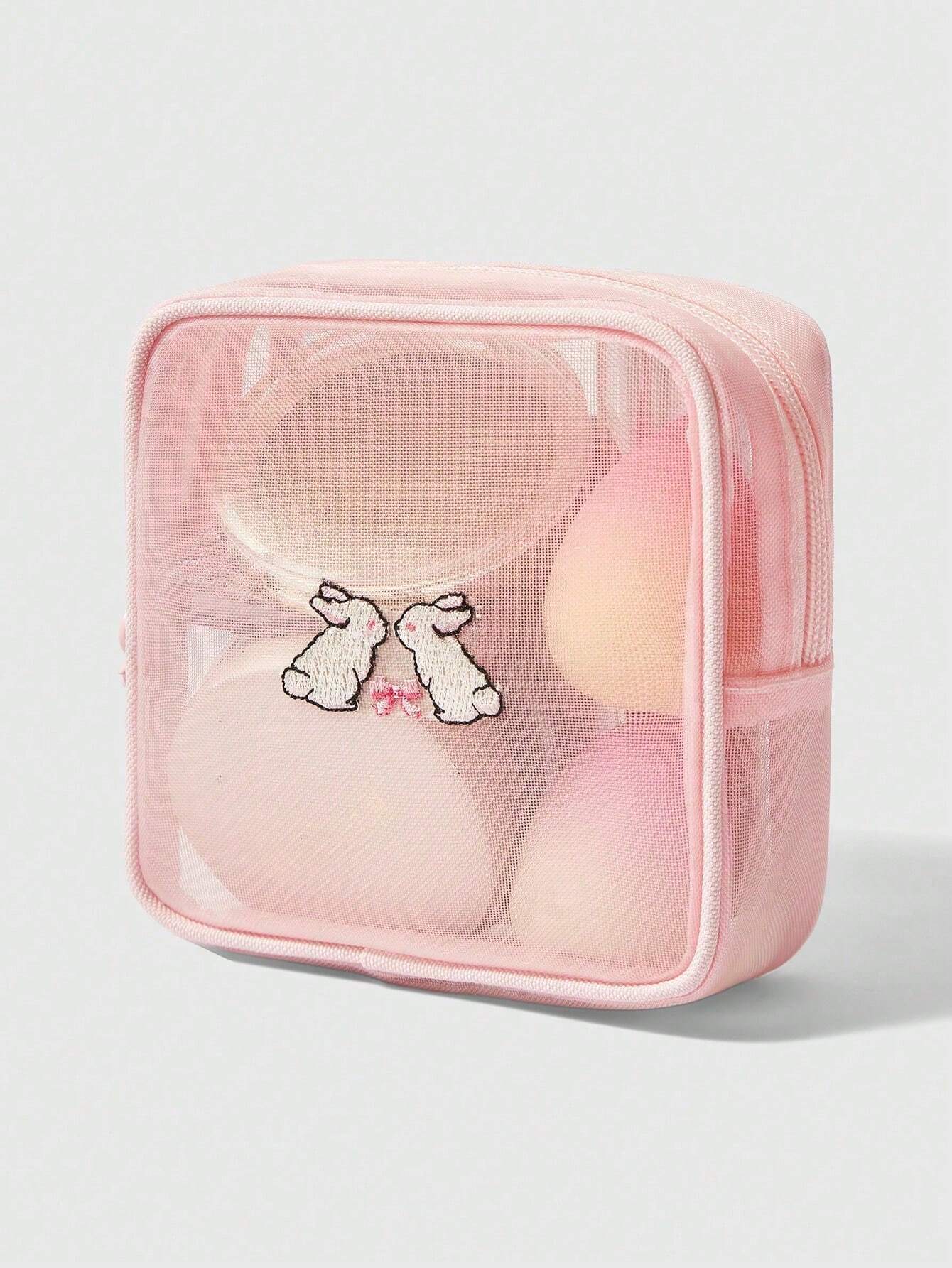 Kawaii Net Lace Embroidery Cartoon Rabbit Pattern Large Capacity Portable Makeup Bag For Women