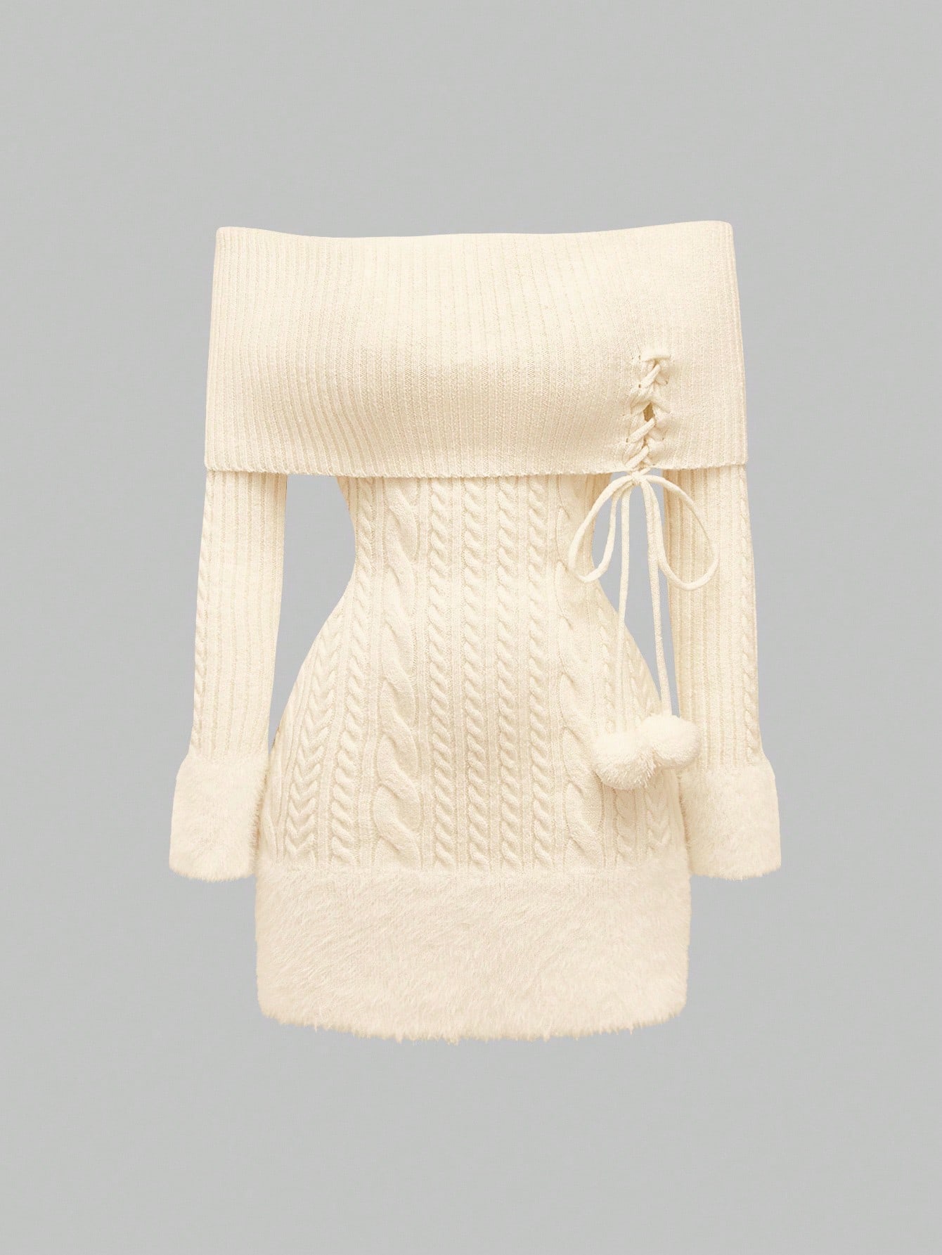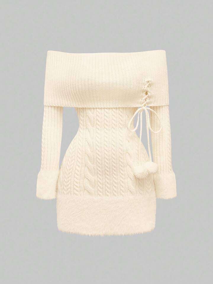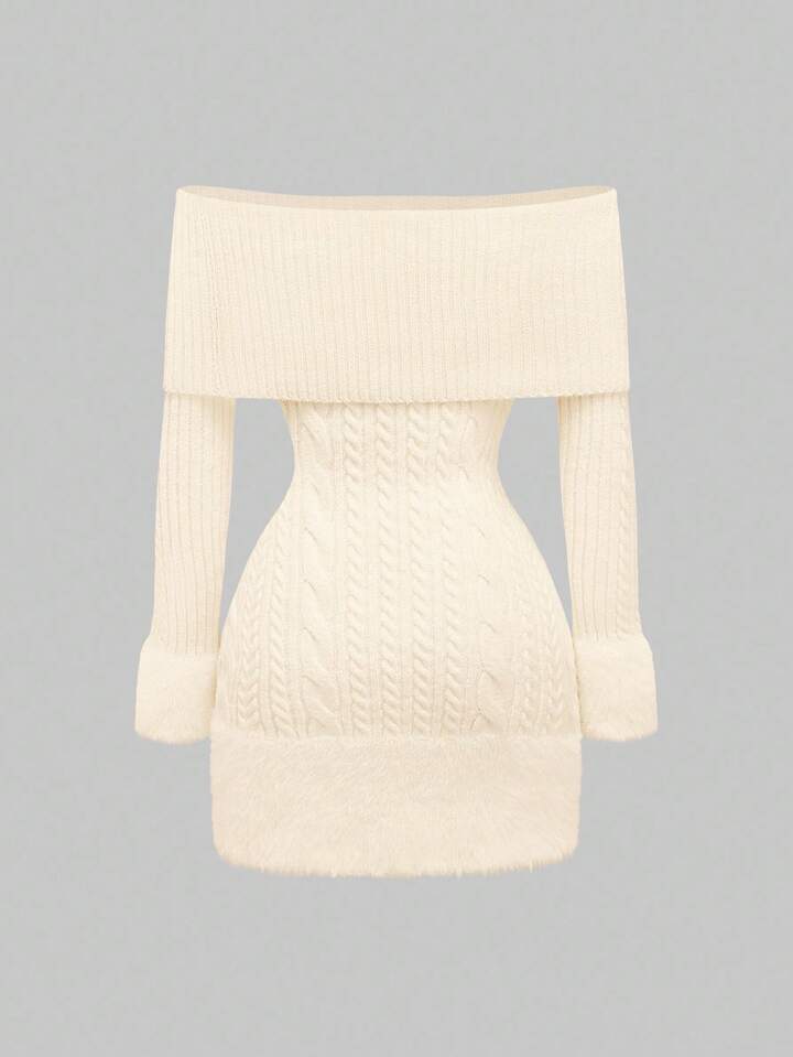 Kawaii Off-Shoulder Furball Pendant Decorated Fuzzy Patchwork Women's Sweater Party Dress, Suitable For New Year, Valentine's Day