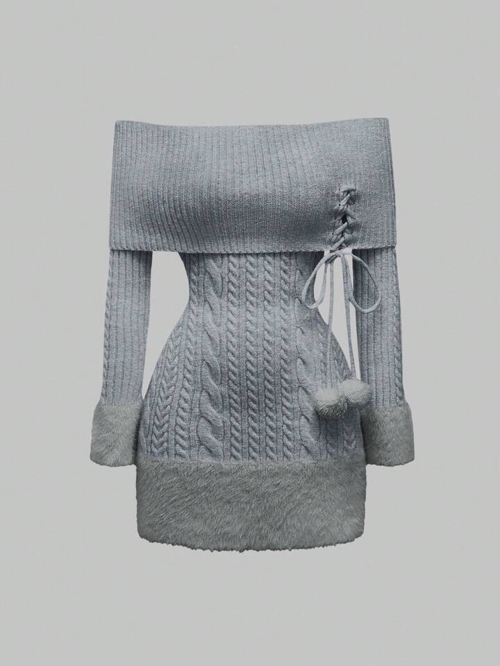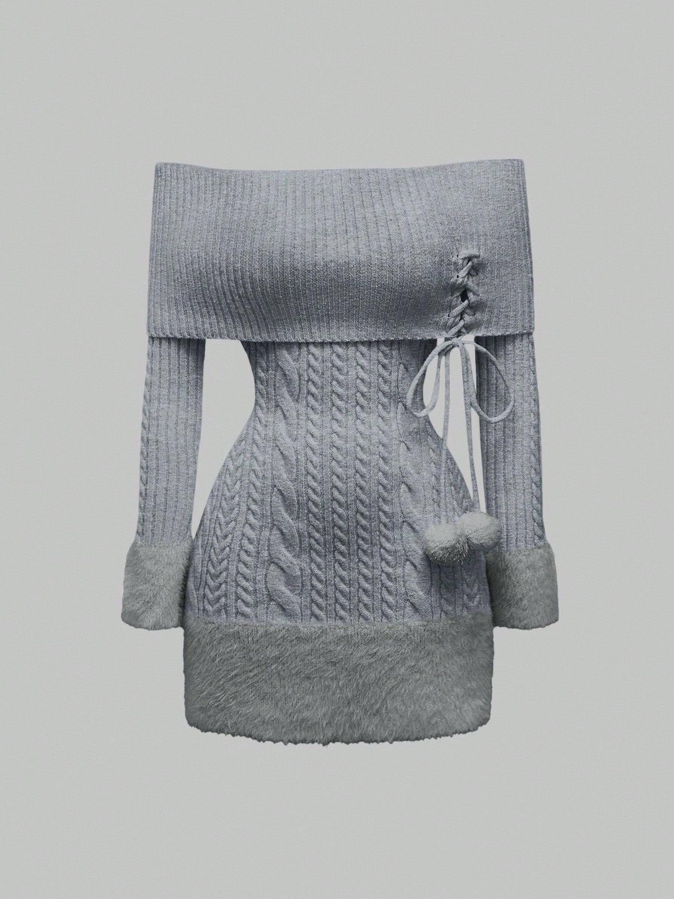 Kawaii Off-Shoulder Furball Pendant Decorated Fuzzy Patchwork Women's Sweater Party Dress, Suitable For New Year, Valentine's Day