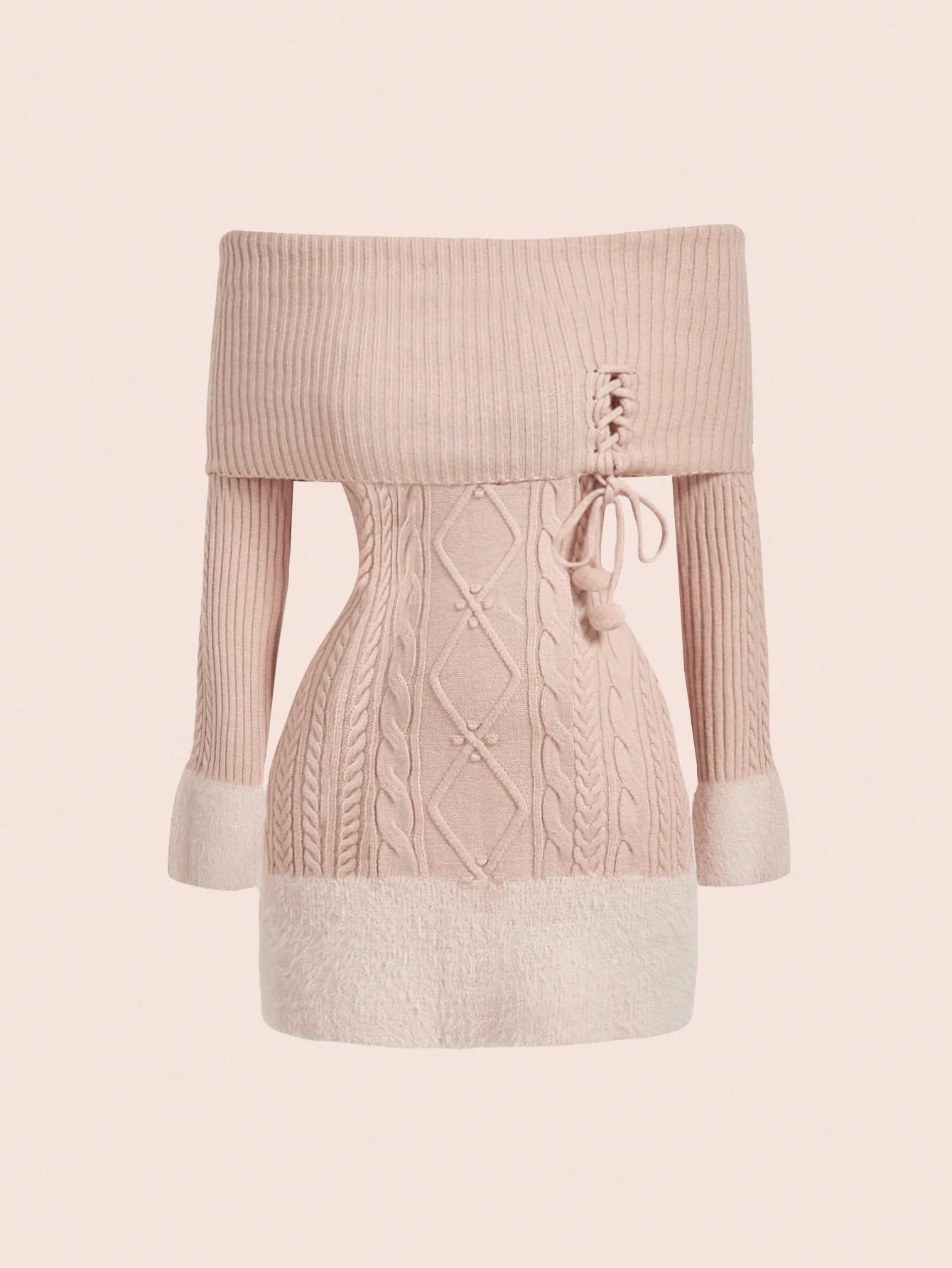 Kawaii Off-Shoulder Furball Pendant Decorated Patchwork Plus Size Women Sweater Party Dress, Suitable For New Year, Valentine's Day