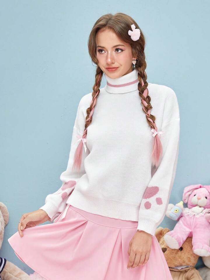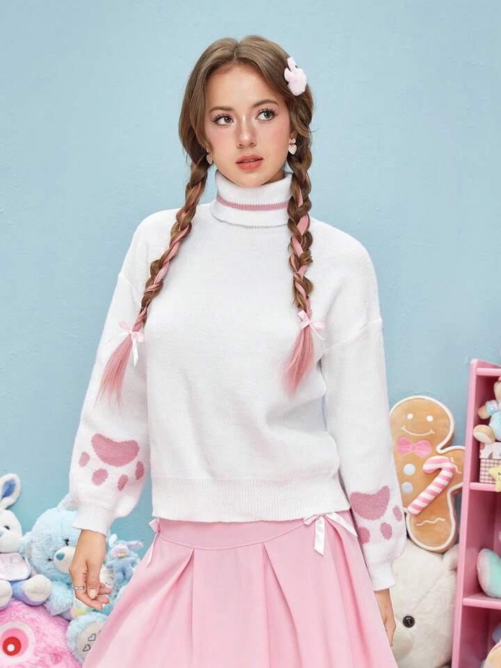 Kawaii Paw Pattern Turtleneck Drop Shoulder Sweater