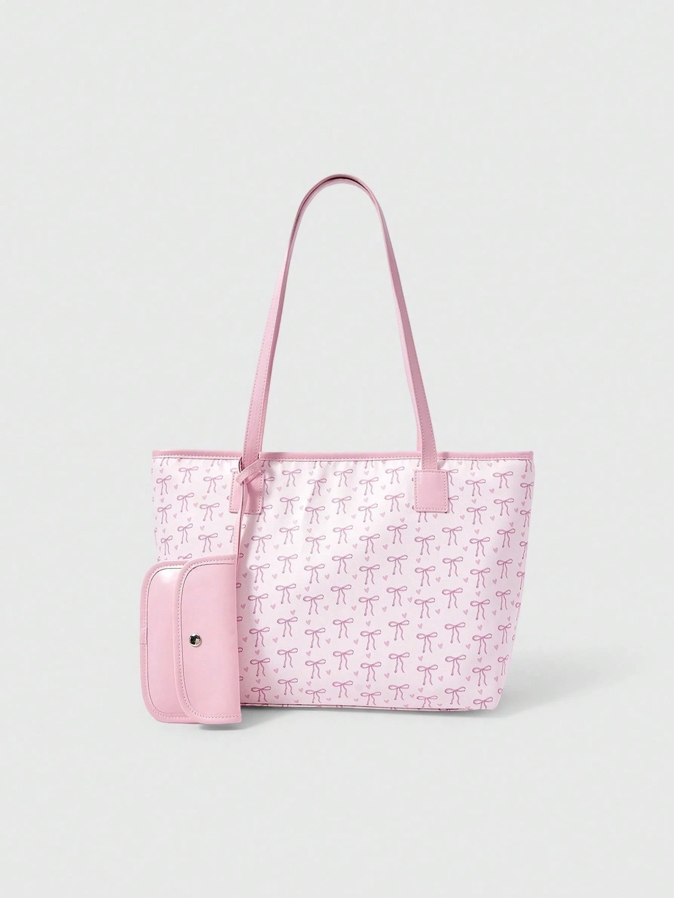 Kawaii Pink Vintage Cute Bow Decor Versatile Commuter Capacity Tote Bag + Mini Pouch For Women