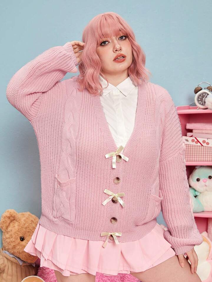 Kawaii Plus Cable Knit Drop Shoulder Bow Front Cardigan