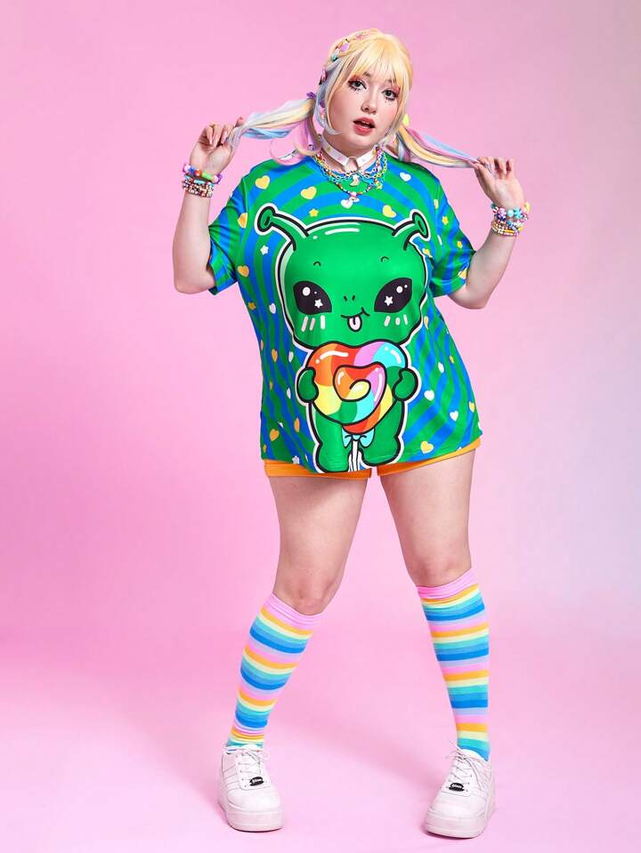 Kawaii Plus Cartoon Graphic Drop Shoulder Tee