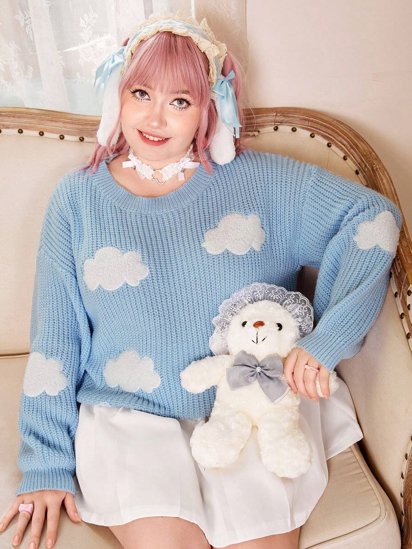 Kawaii Plus Cloud Pattern Drop Shoulder Sweater