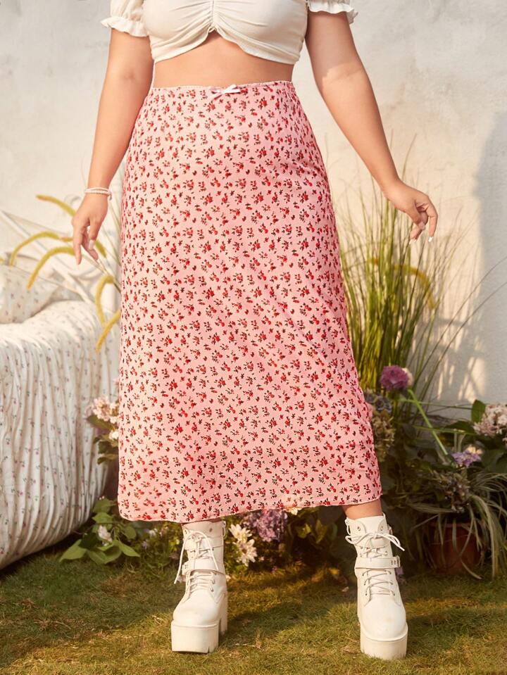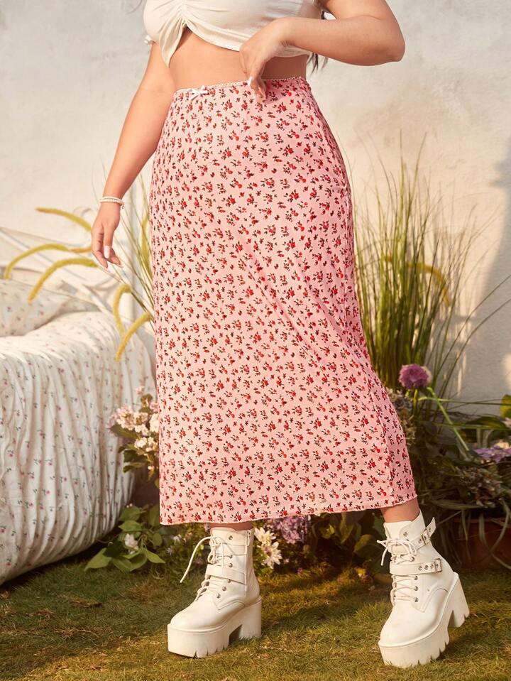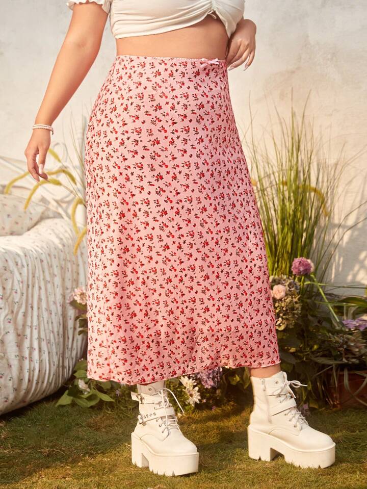 Kawaii Plus Ditsy Floral Print Mesh Overlay Skirt