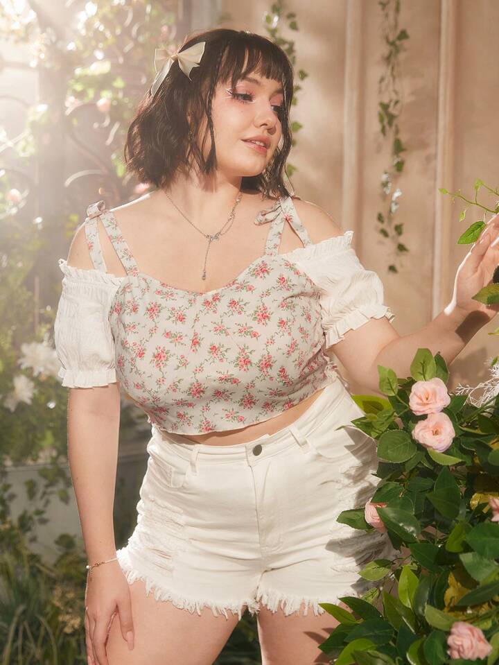 Kawaii Plus Ditsy Floral Print Shirred Crop Cami Top