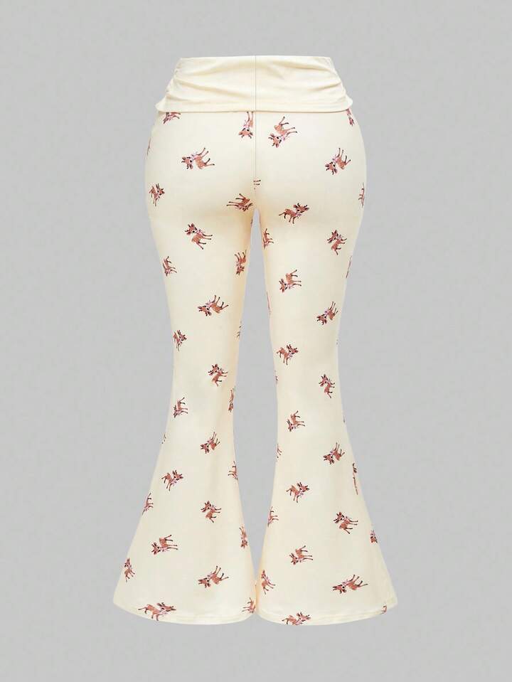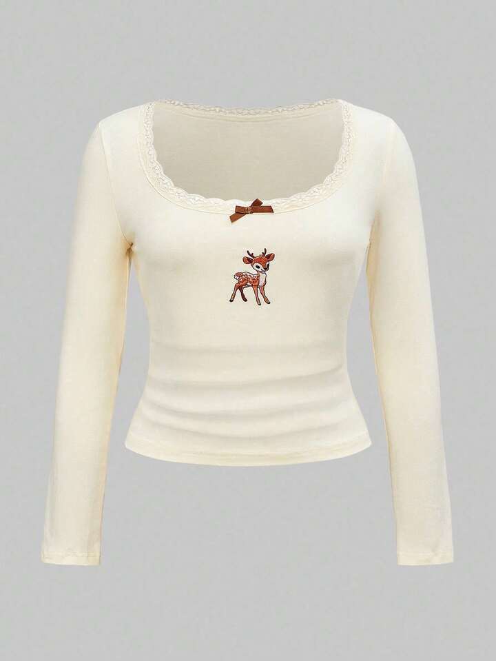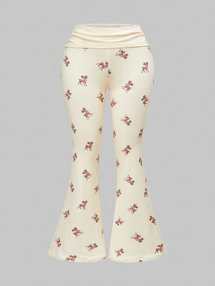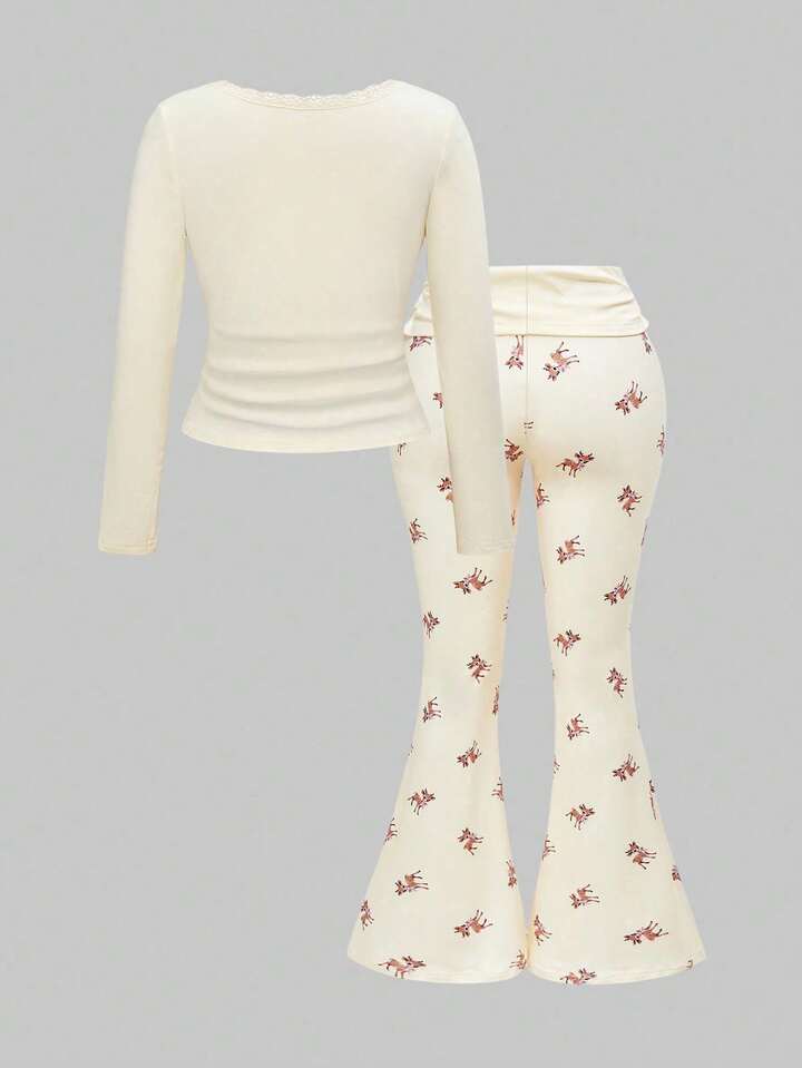 Kawaii Plus Size Cute Deer Embroidery Lace Blouse & Deer Print Flare Pants 2 Pieces Set, Autumn/Winter