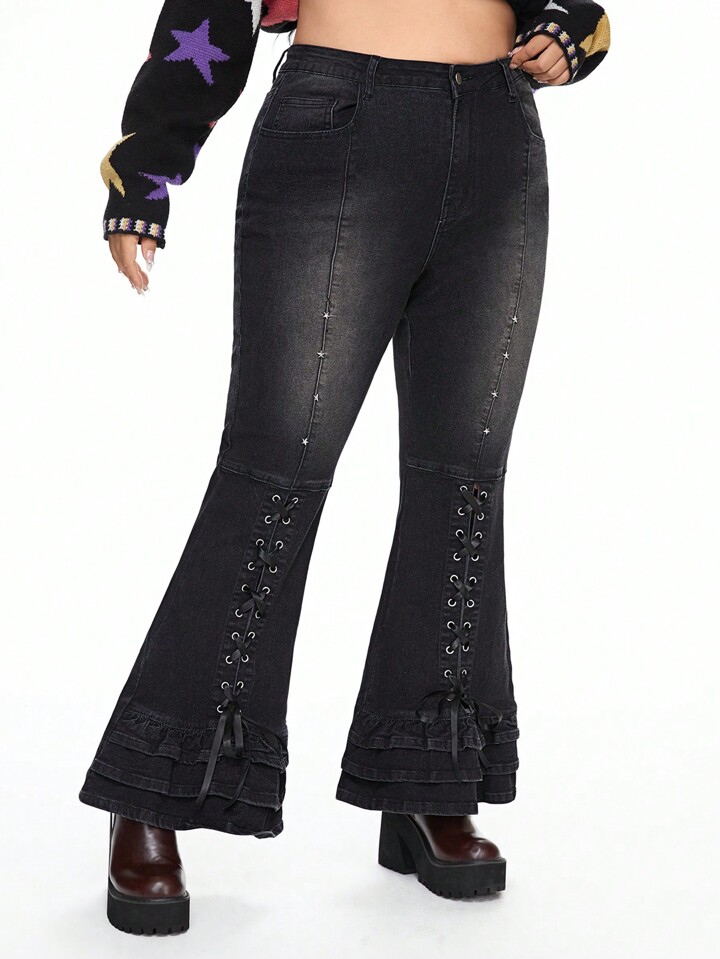 Kawaii Plus Size Front Button Casual Ruffle Trim Denim Pants