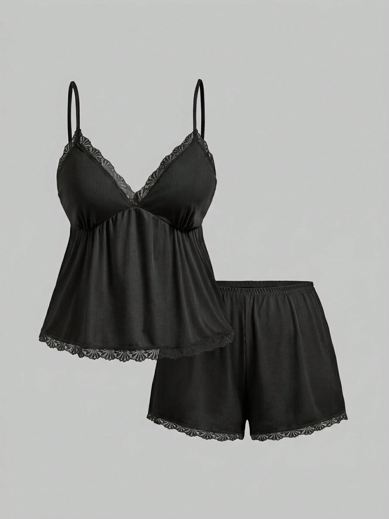 Kawaii Plus Size Sweet & Cute Doll Style Ribbed Lace Camisole & Shorts Sleepwear Set