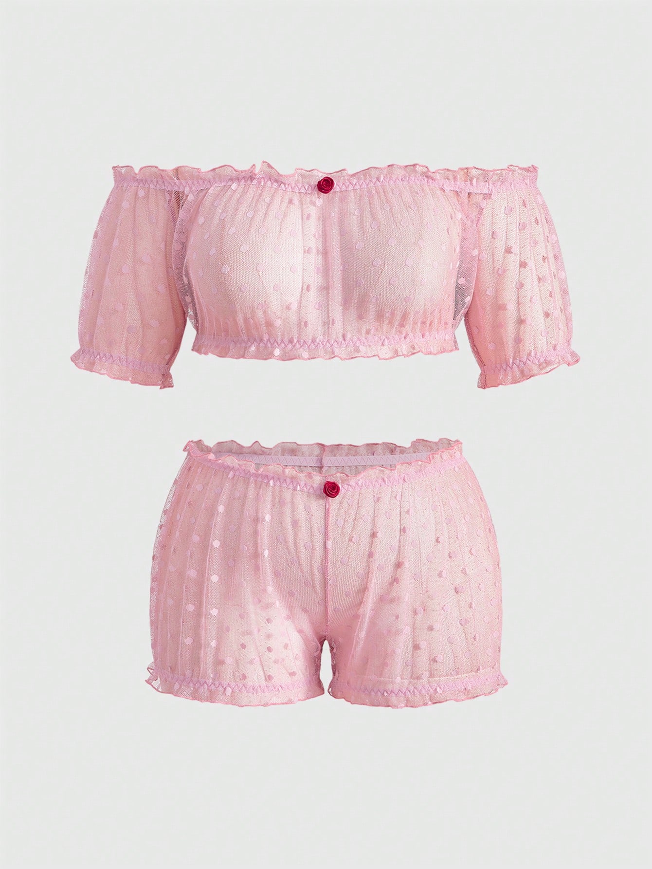 Kawaii Plus Size Valentine's Day Cute & Sweet Floral Jacquard 3D Rose Off Shoulder Ruched Briefs Sexy Lingerie Set