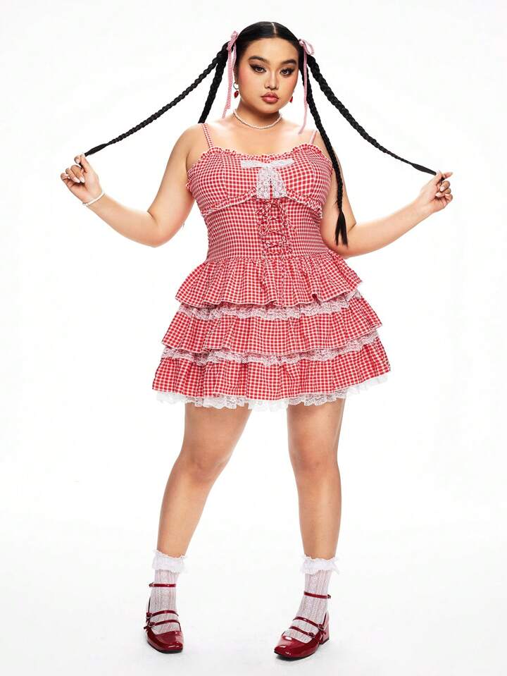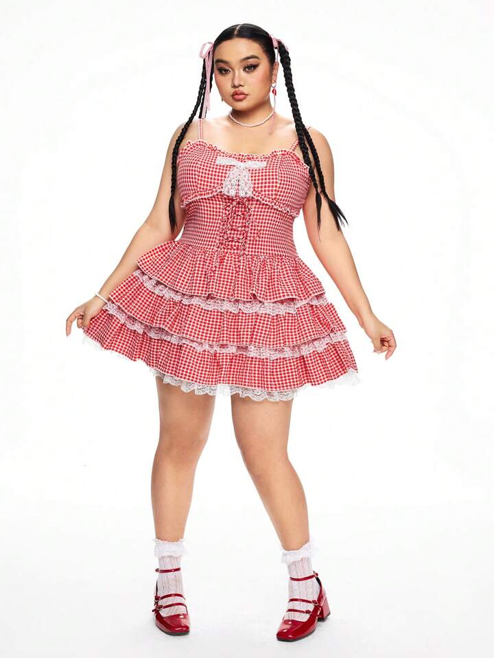 Kawaii Plus Size Women Plaid Multilayer Lace Tie Bow Mini Spaghetti Strap Dress, Summer Outfit