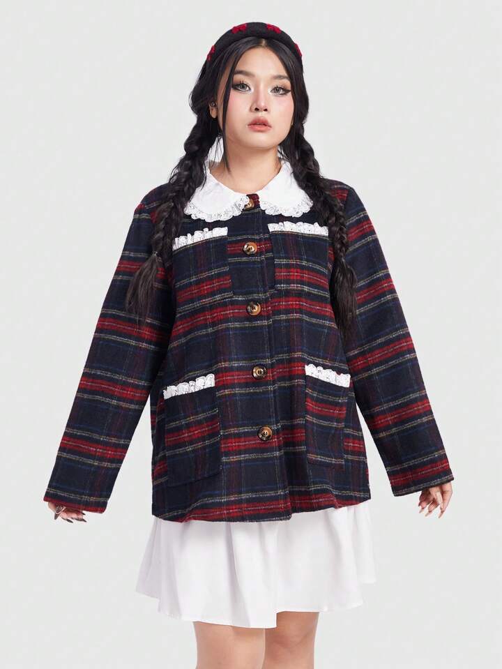 Kawaii Plus Size Women'S Plaid Double Pocket Coat