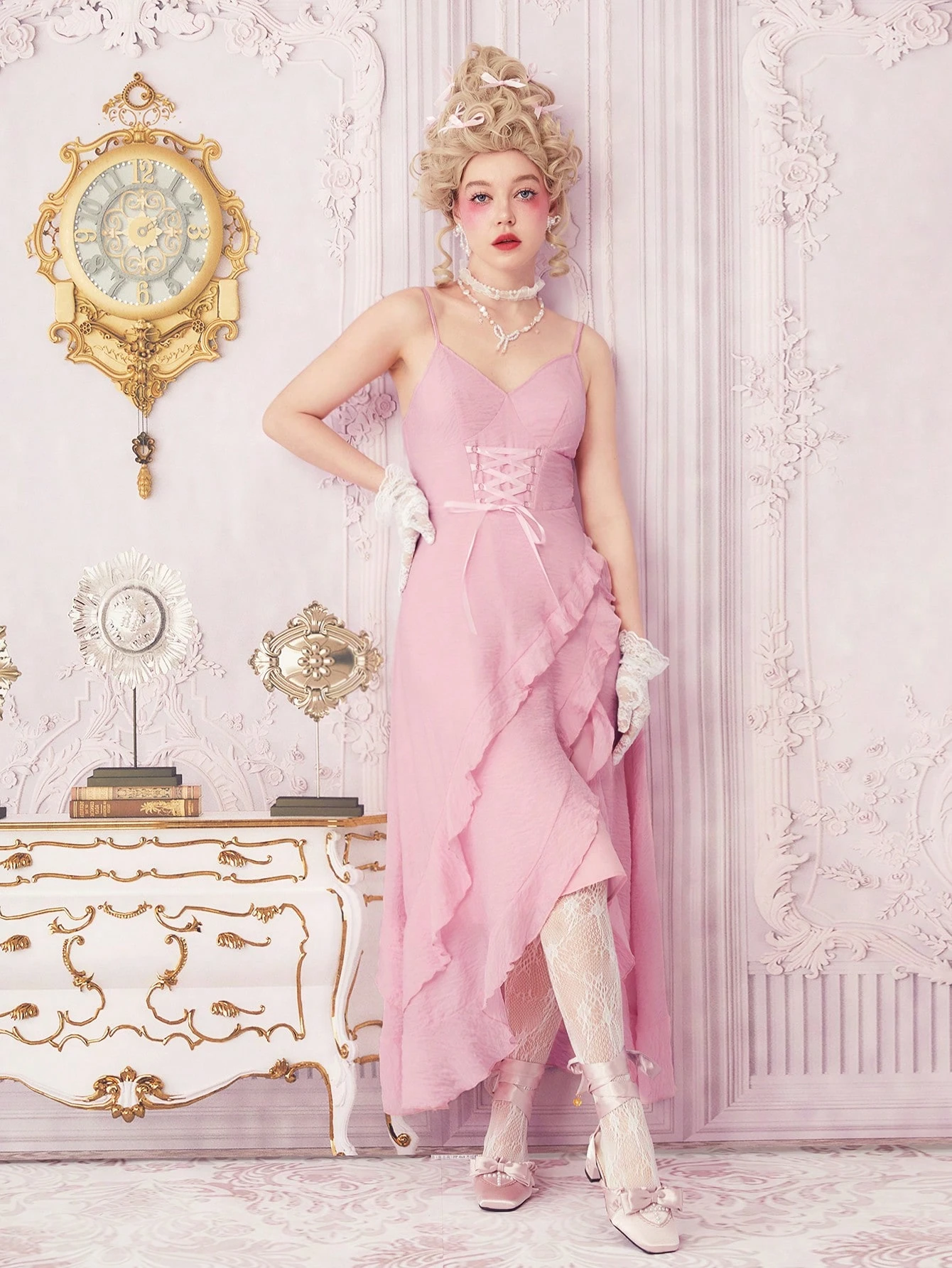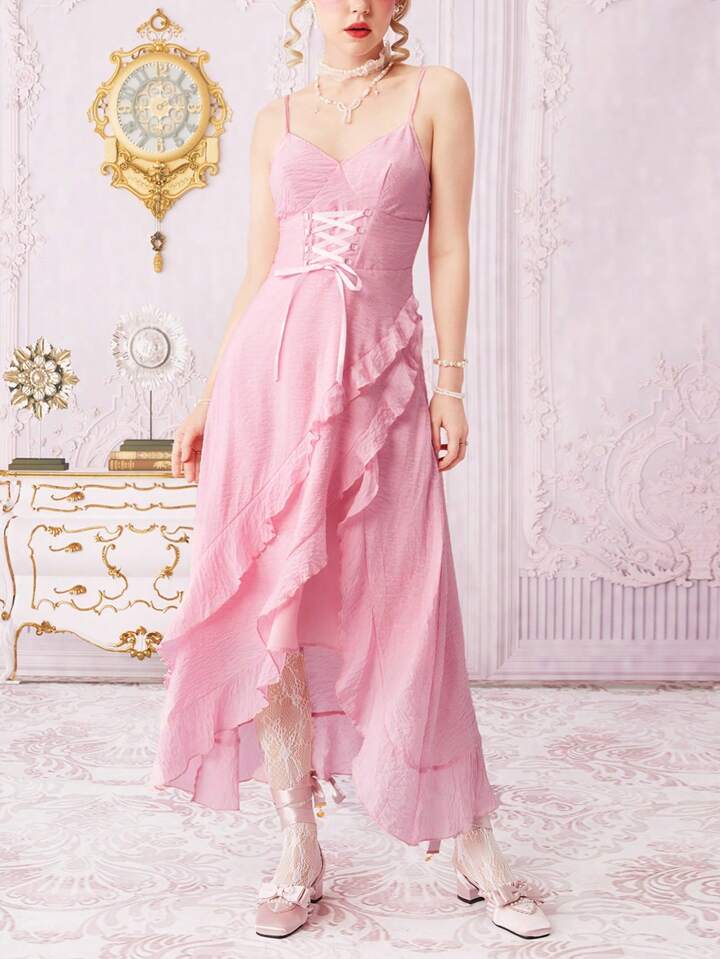Kawaii Ruffle Trim Lace Up Front Cami Dress