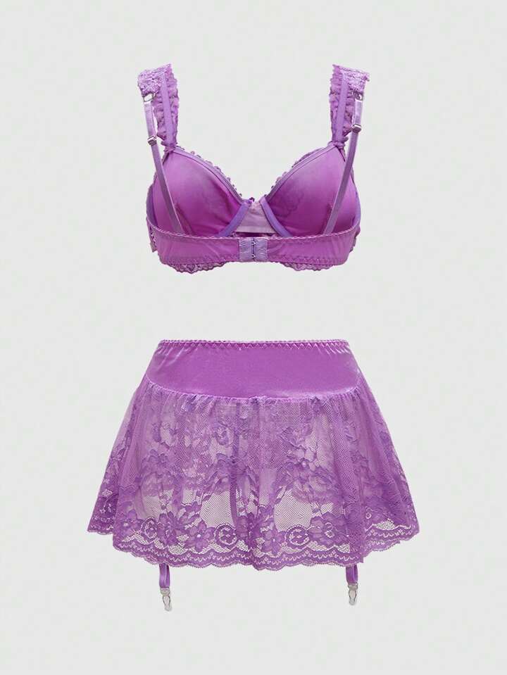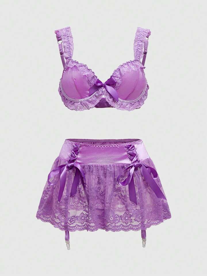 Kawaii Satin Lace Patchwork Bowknot Underwire Sexy Lingerie Set