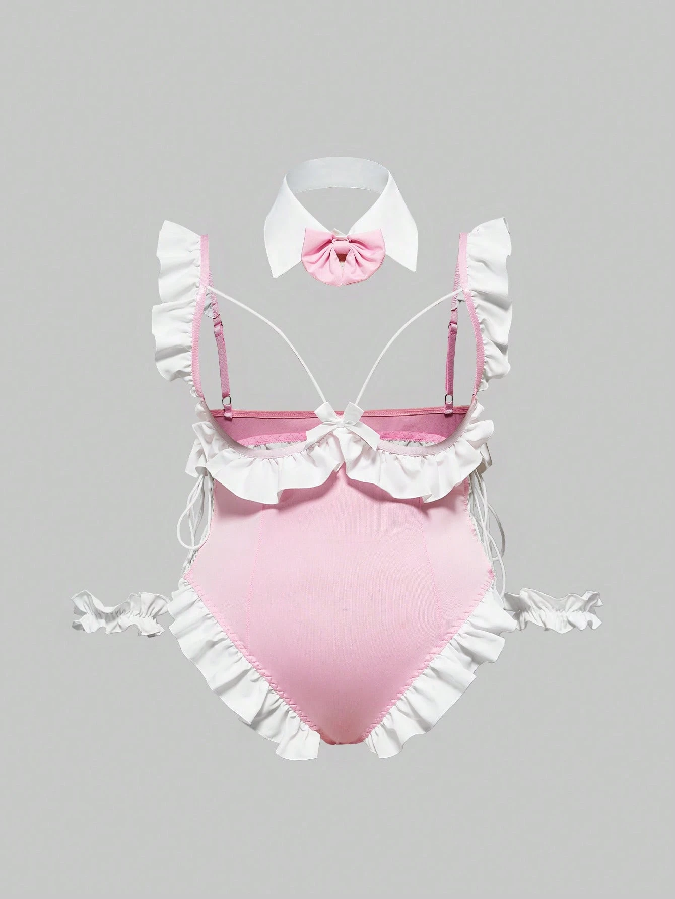 Kawaii Sexy Maid Outfit Hollow Out Ruffle Hem Bowknot Plus Size Bodysuit For Women