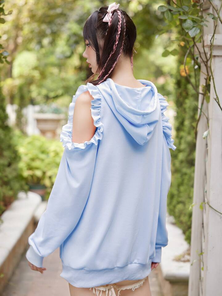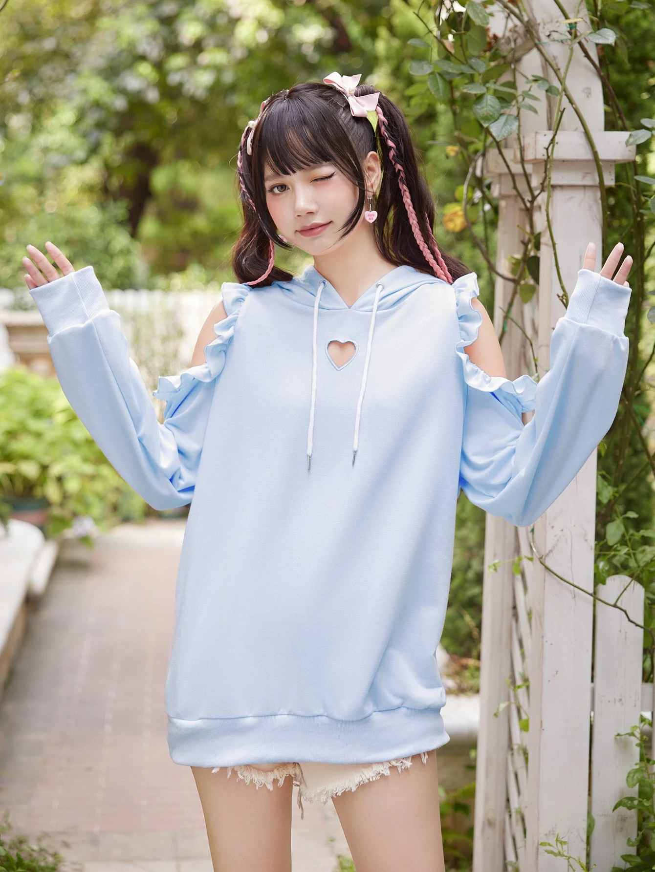 Kawaii Solid Cut Out Ruffle Trim Drawstring Hoodie