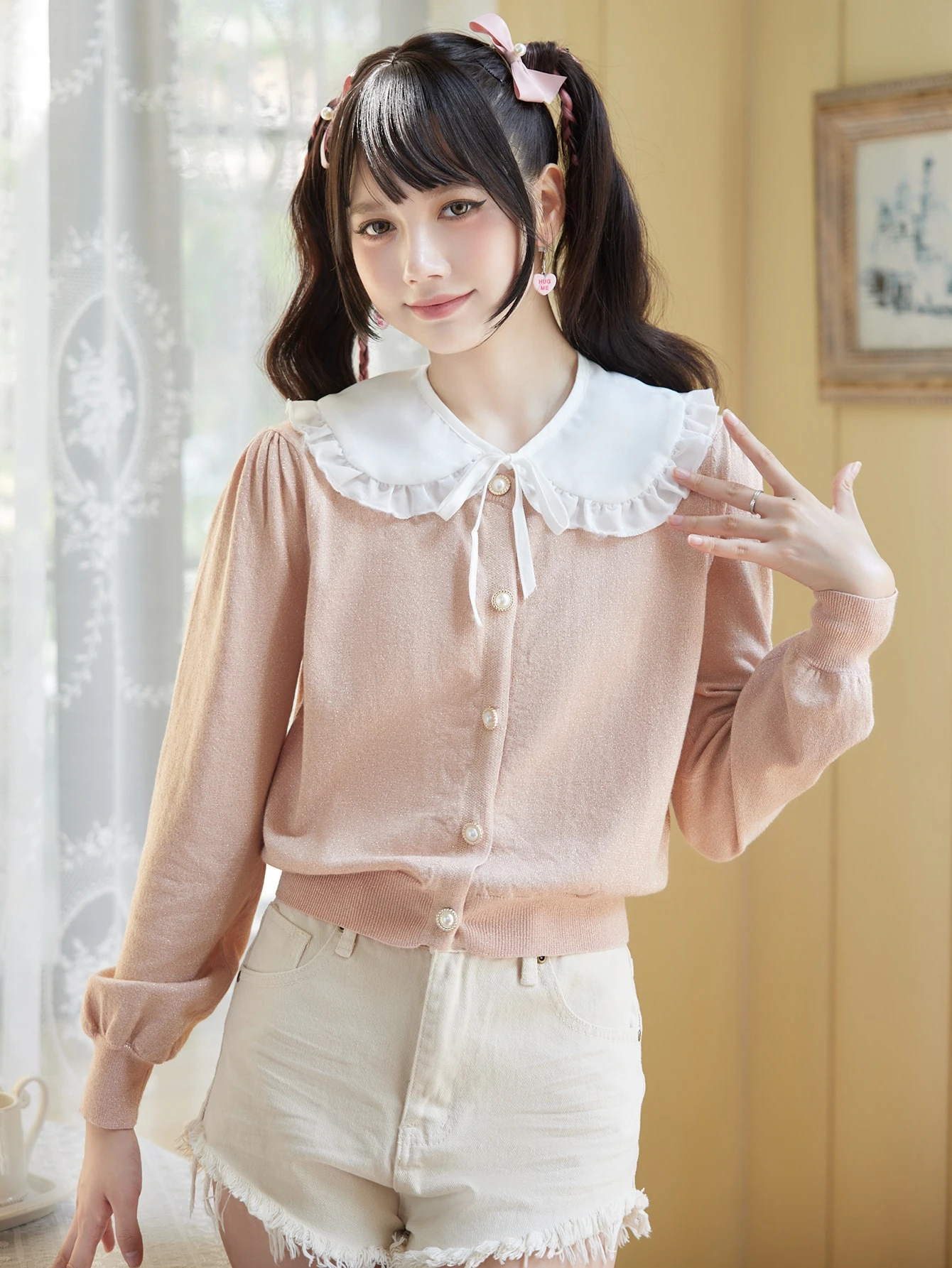 Kawaii Solid Pearls Button Front Cardigan Without Dickey Collar