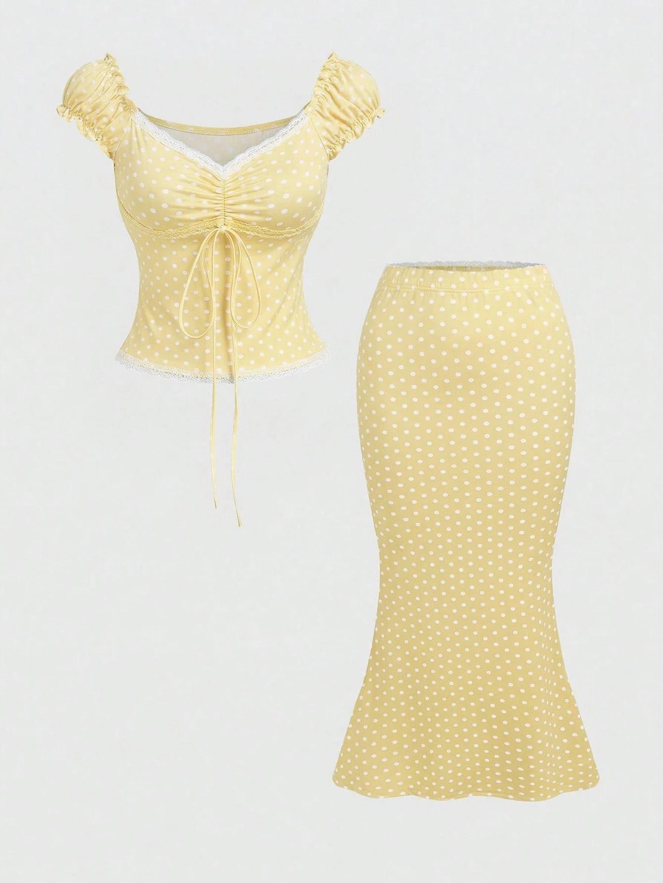 Kawaii Summer Outfits For Women: V-Neck Bowknot Decor Contrast Polka Dot Lace Patchwork Slimming 2-Piece Set, Top + Skirt