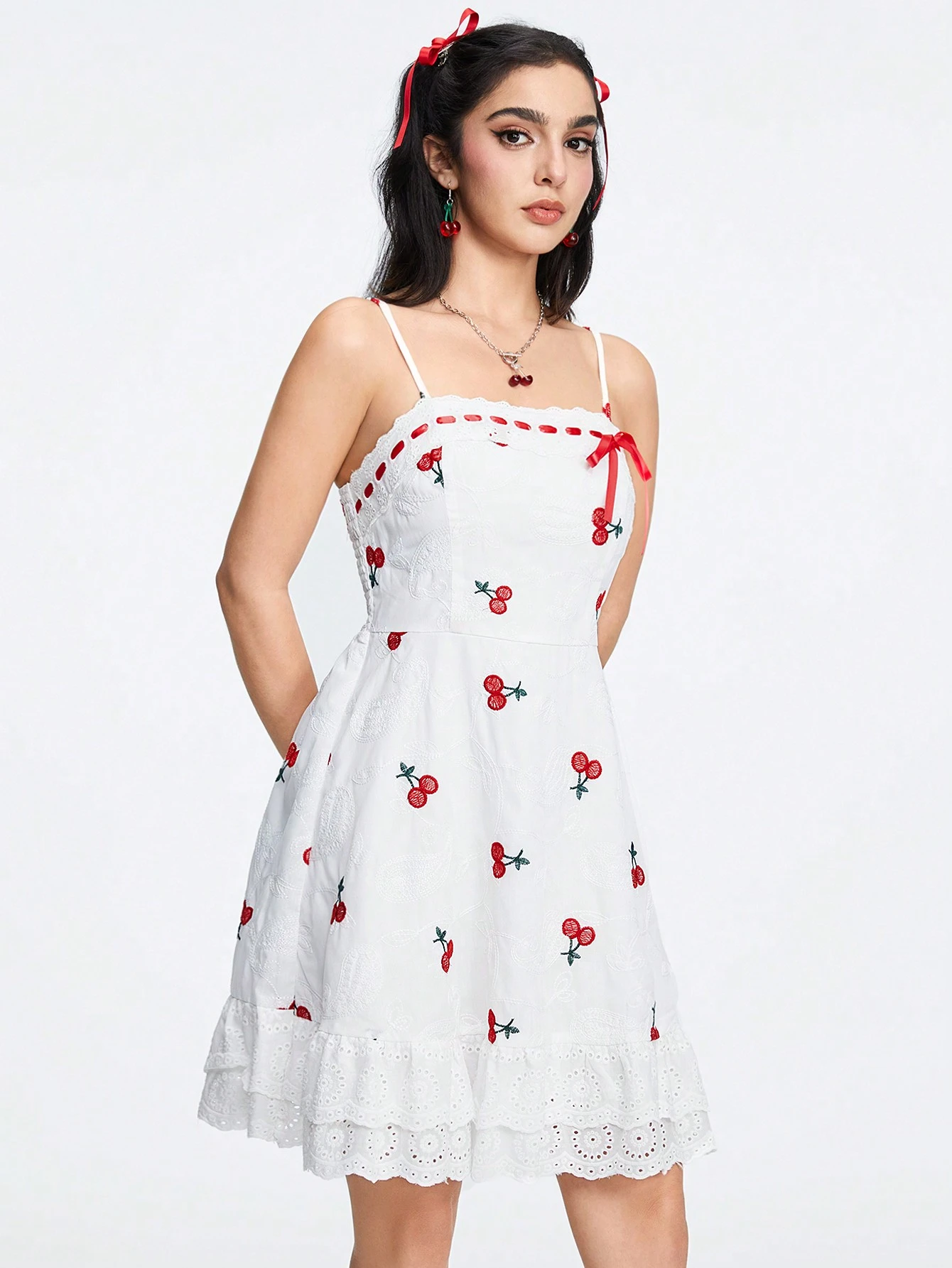 Kawaii Sweet And Lovely Lace-Panelled Cherry Embroidery With Bowknot Satin Ribbon Ladies' Slip Dress