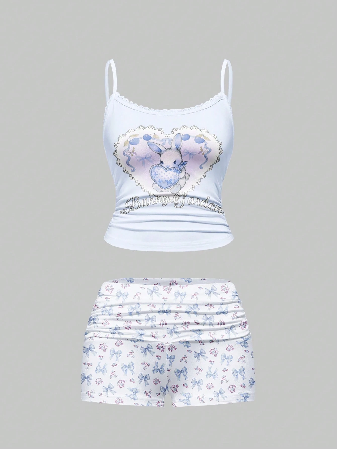 Kawaii Sweet & Cute Rabbit, Butterfly & Floral All-Over Print Lace Camisole & Ruched Shorts Pajama Set, Casual Loungewear