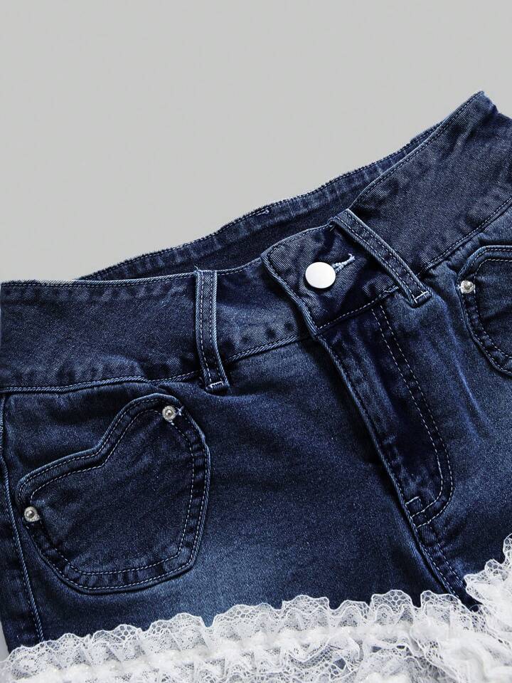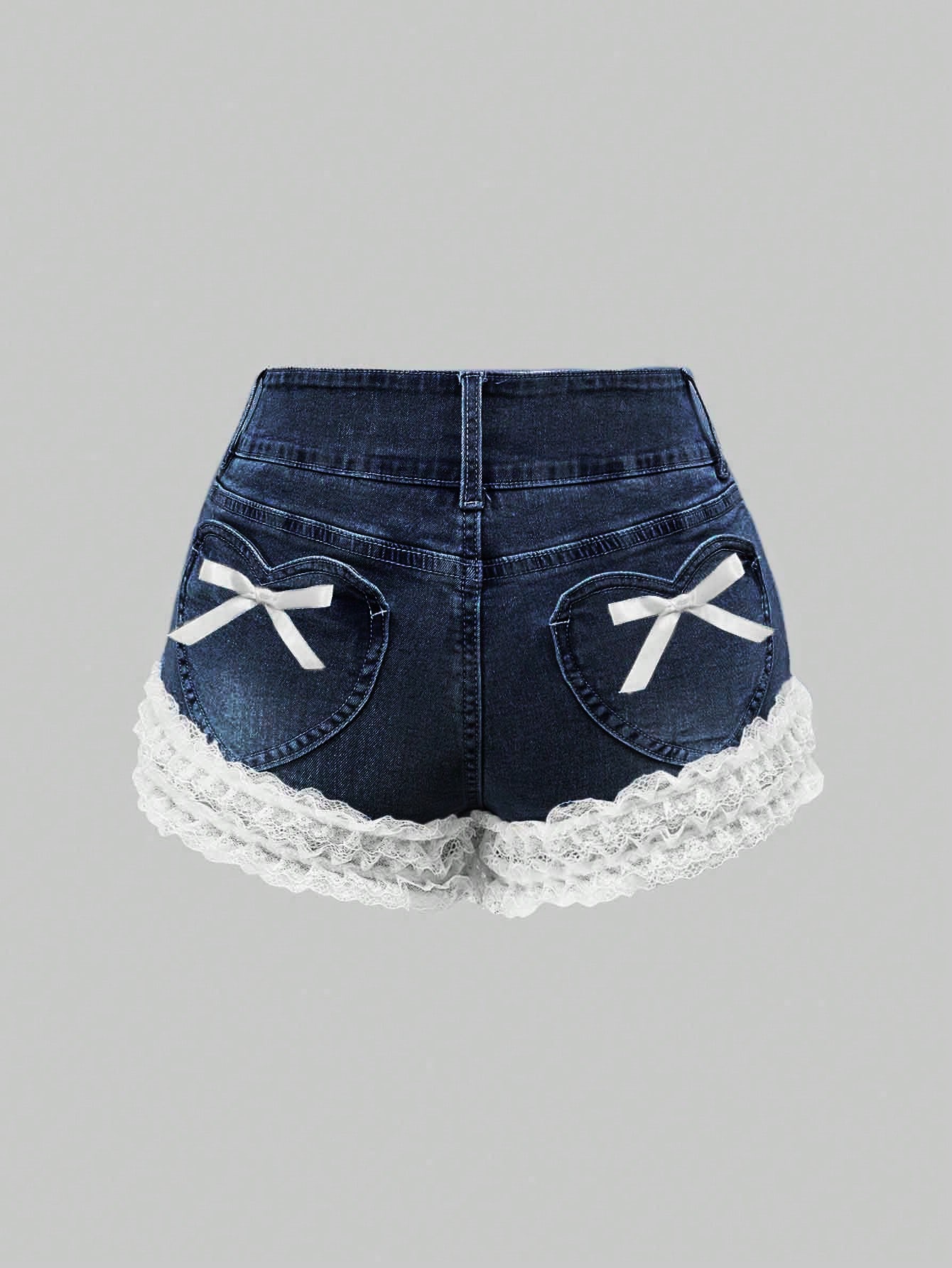 Kawaii Teens Casual Cute Bow Decor Heart Pocket Contrast Lace Trim Denim Shorts