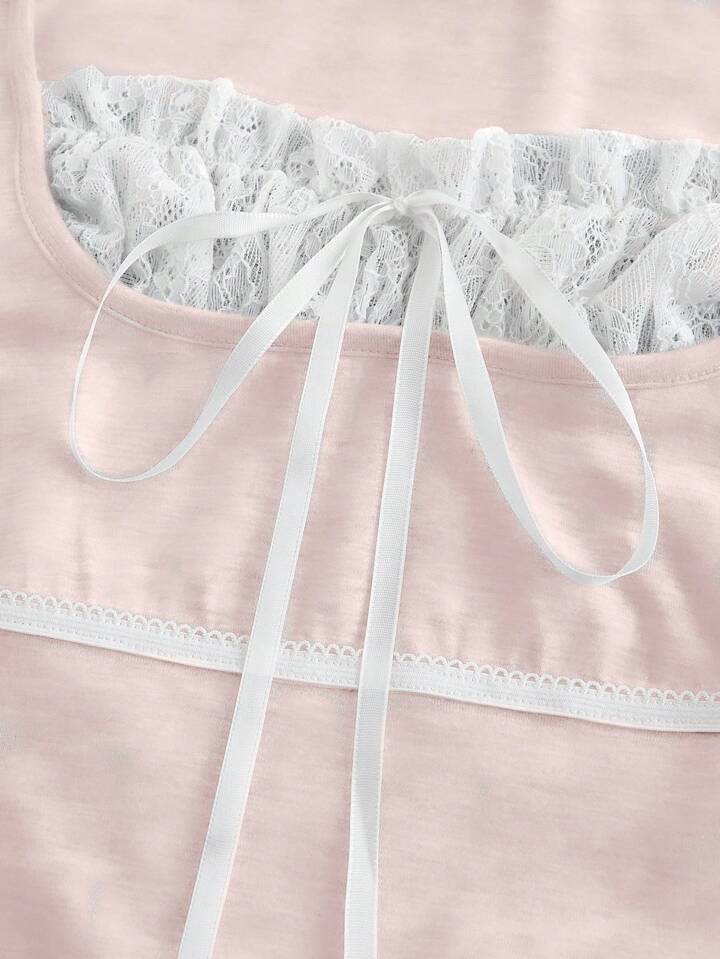 Kawaii Valentine's Day Square Neck Lace Patchwork Ballet Colorblock Puff Sleeve Women Tee