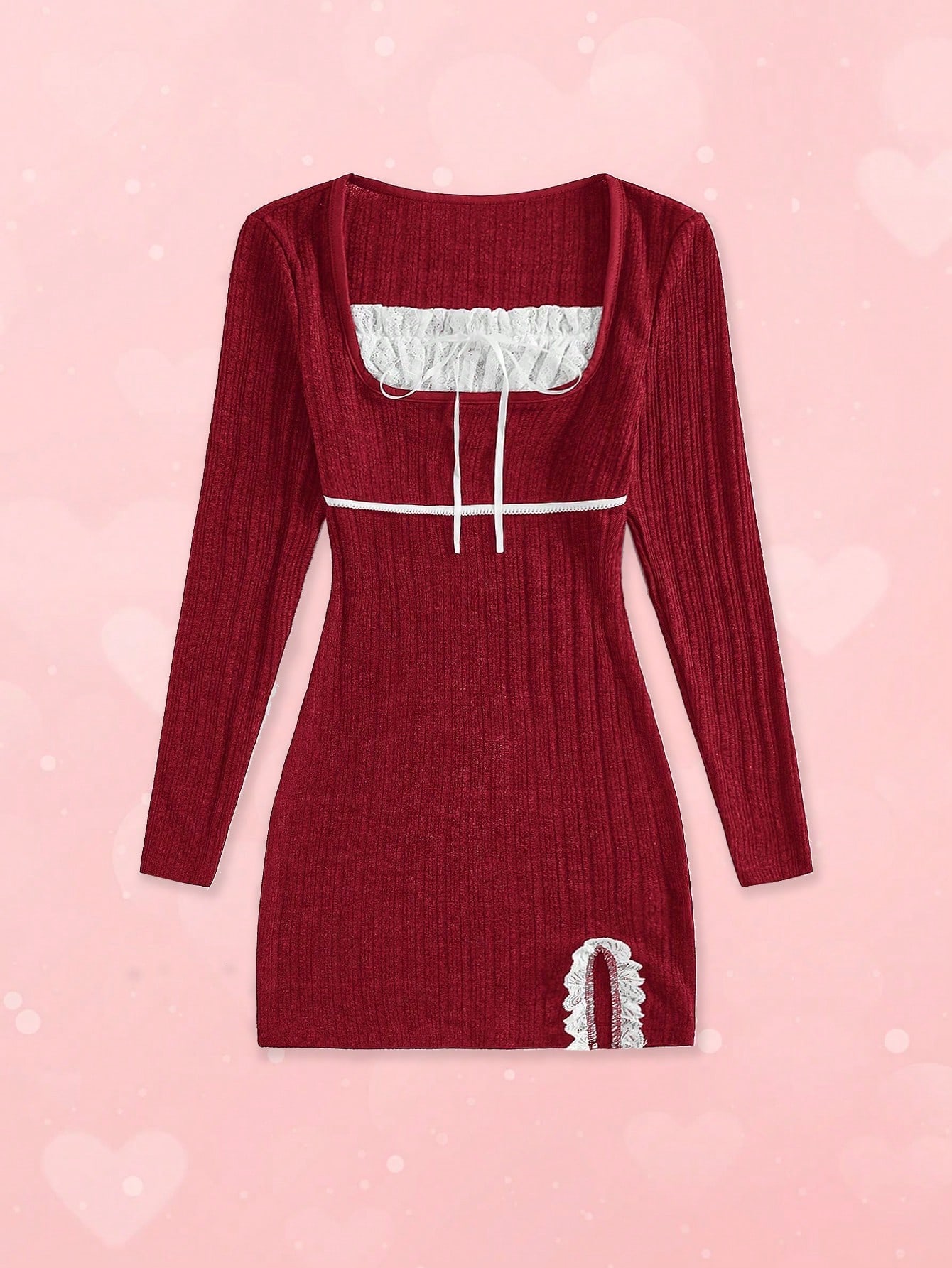Kawaii Valentine's Day Sweetheart Neck Lace Splice Ballet Colorblock Tight Bodycon Dress For Women