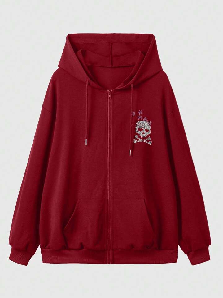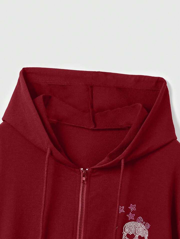 Kawaii Women Casual Skull And Star Pattern Rhinestone Decor Zip-Up Drawstring Hooded Sweatshirt, Spring/Autumn