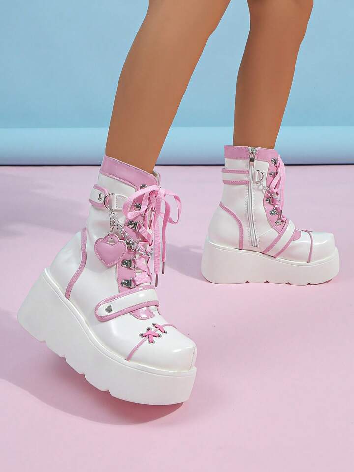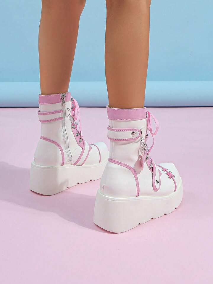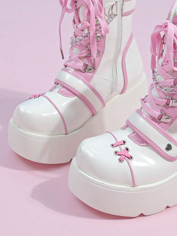 Kawaii Women Chain Decor Side Zip Lace-up Front Combat Boots, Punk Outdoor Fashion Boots