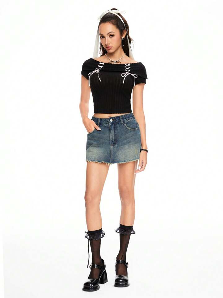 Kawaii Women Crown Embroidered Rhinestone Denim Mini Skirt, School