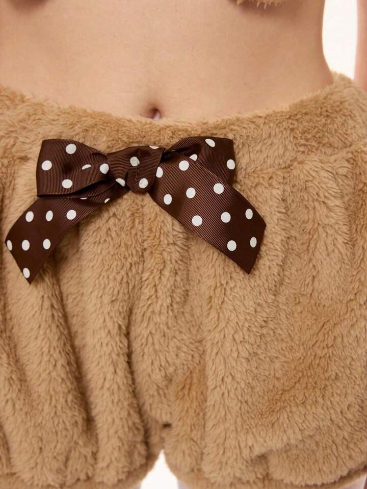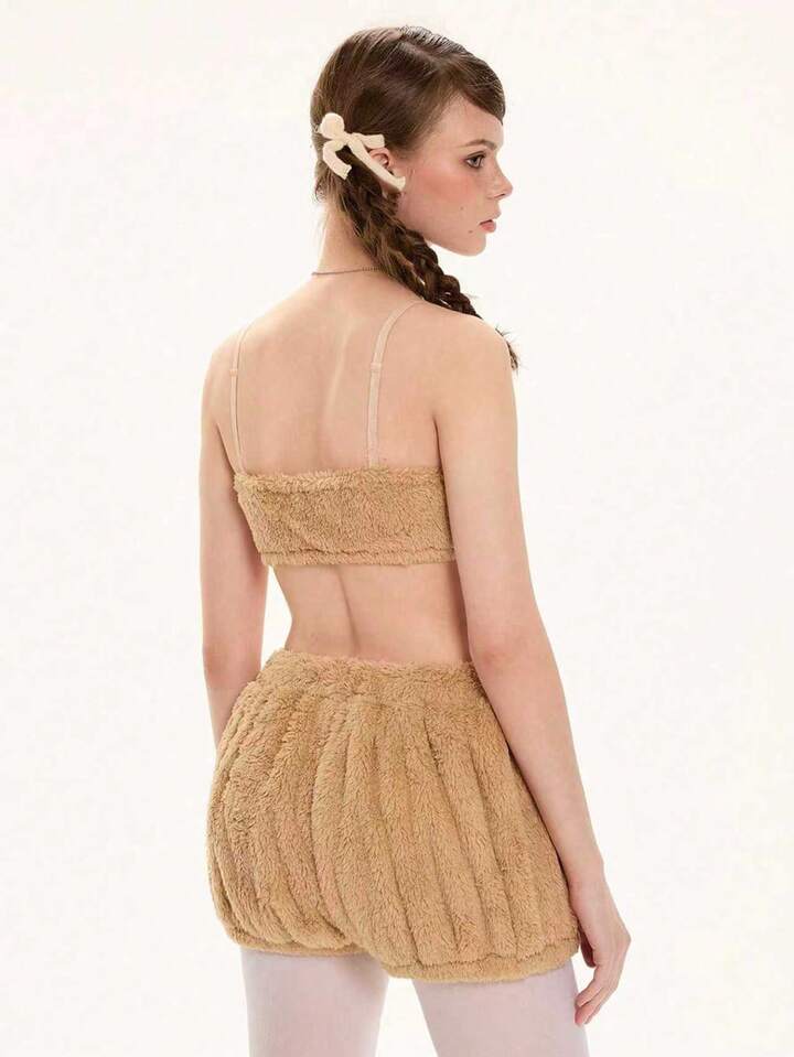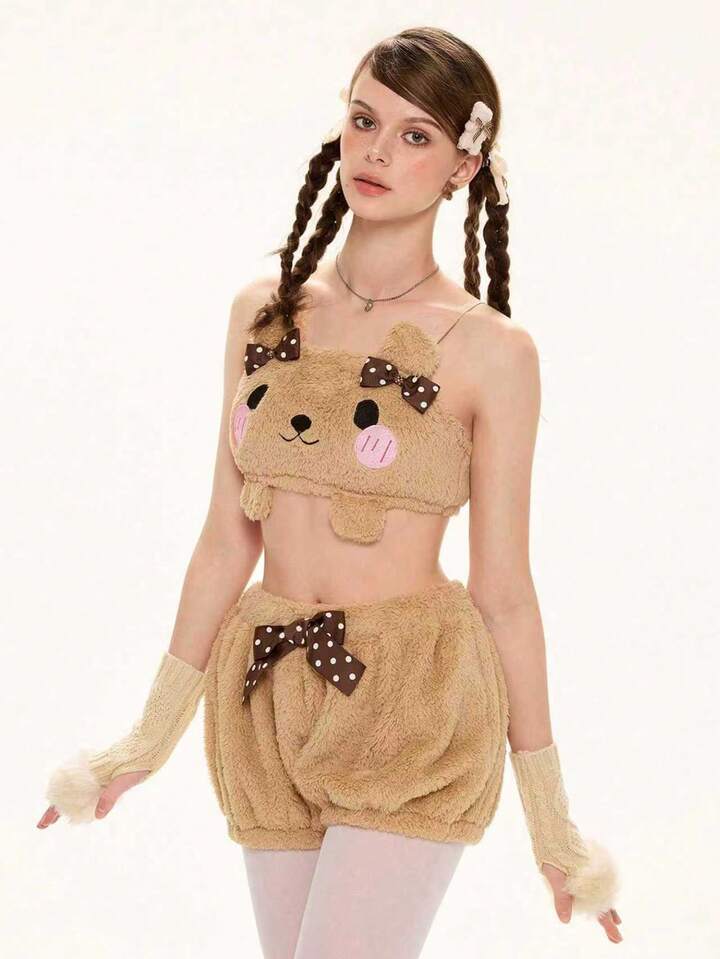 Kawaii Women Cute Cartoon Embroidered 3D Ear Decor Cropped Camisole And Shorts Fluffy 2 Pieces Set