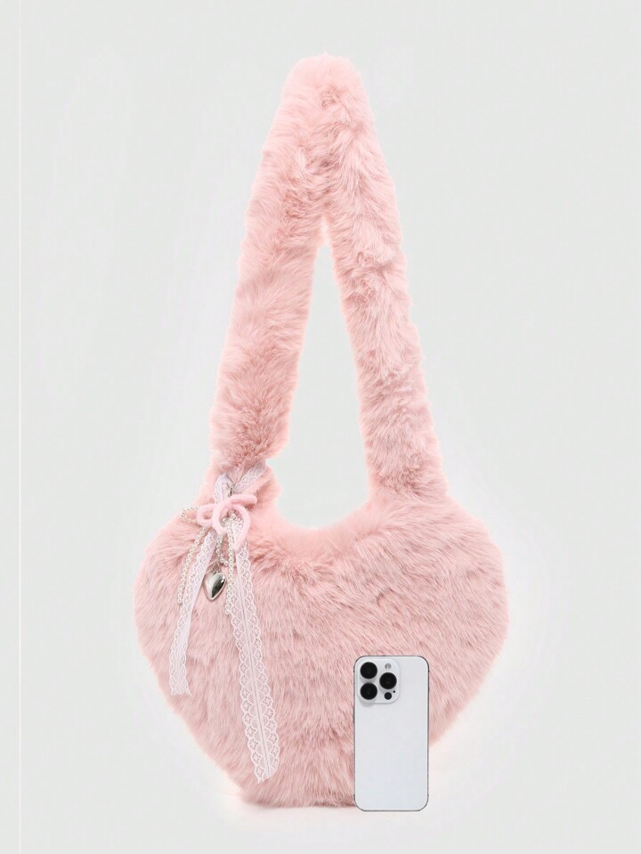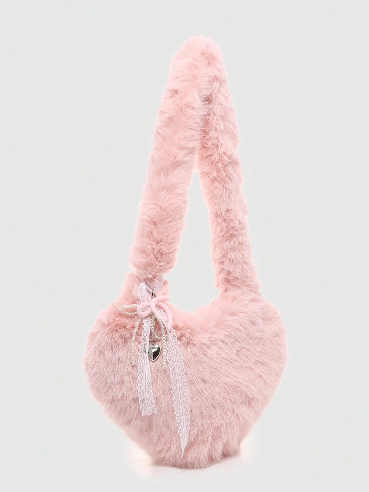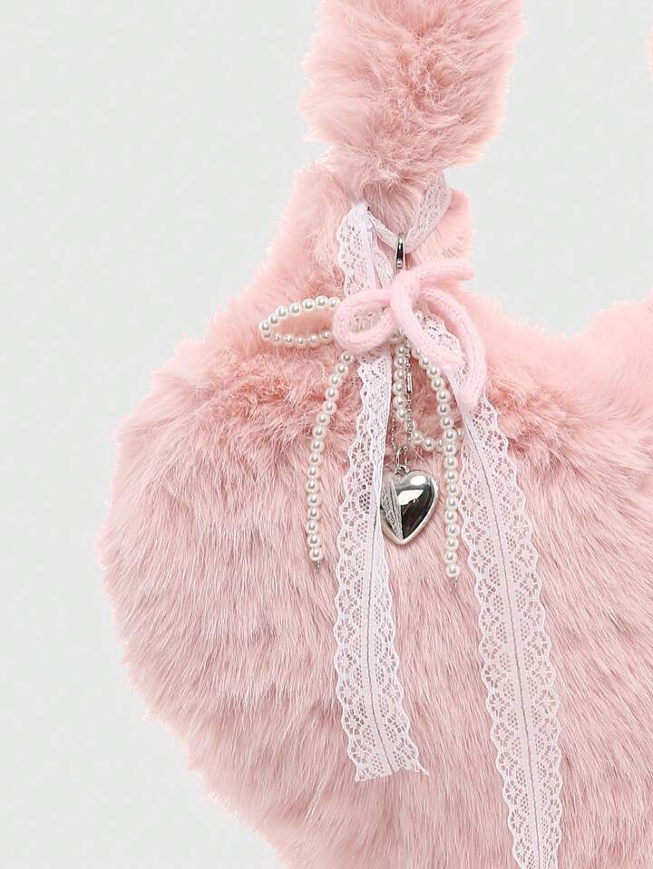 Kawaii Women Fluffy Heart Faux Pearl Bowknot Decor Drawstring Shoulder Bag With Large Capacity