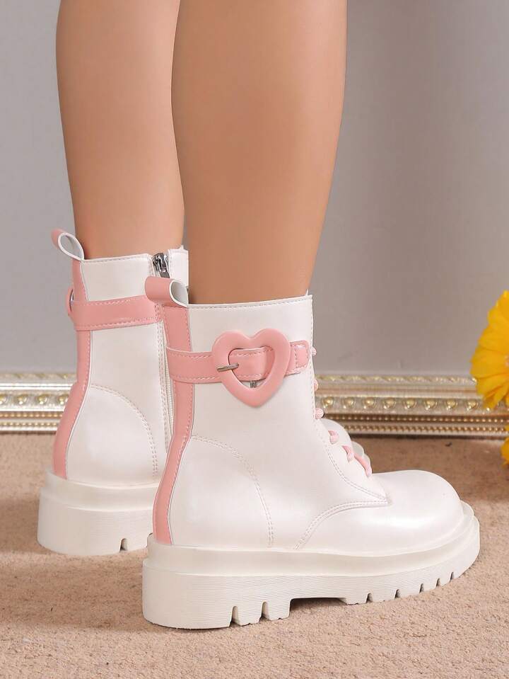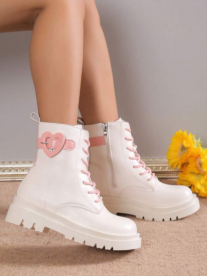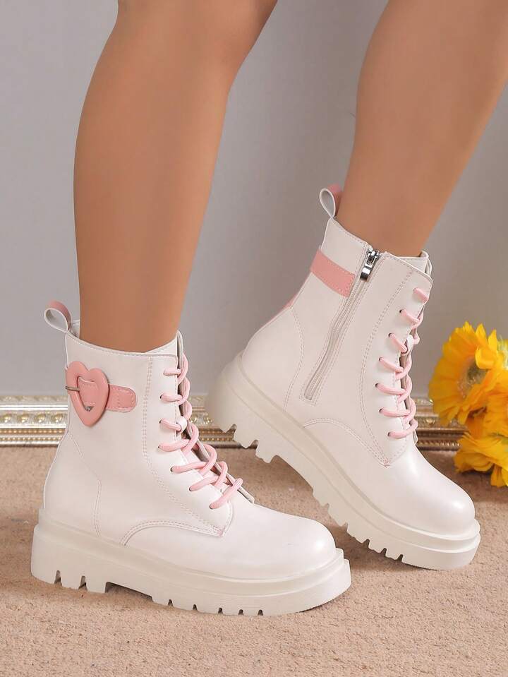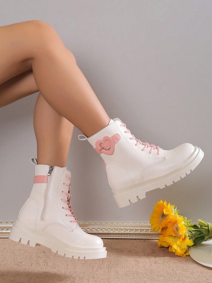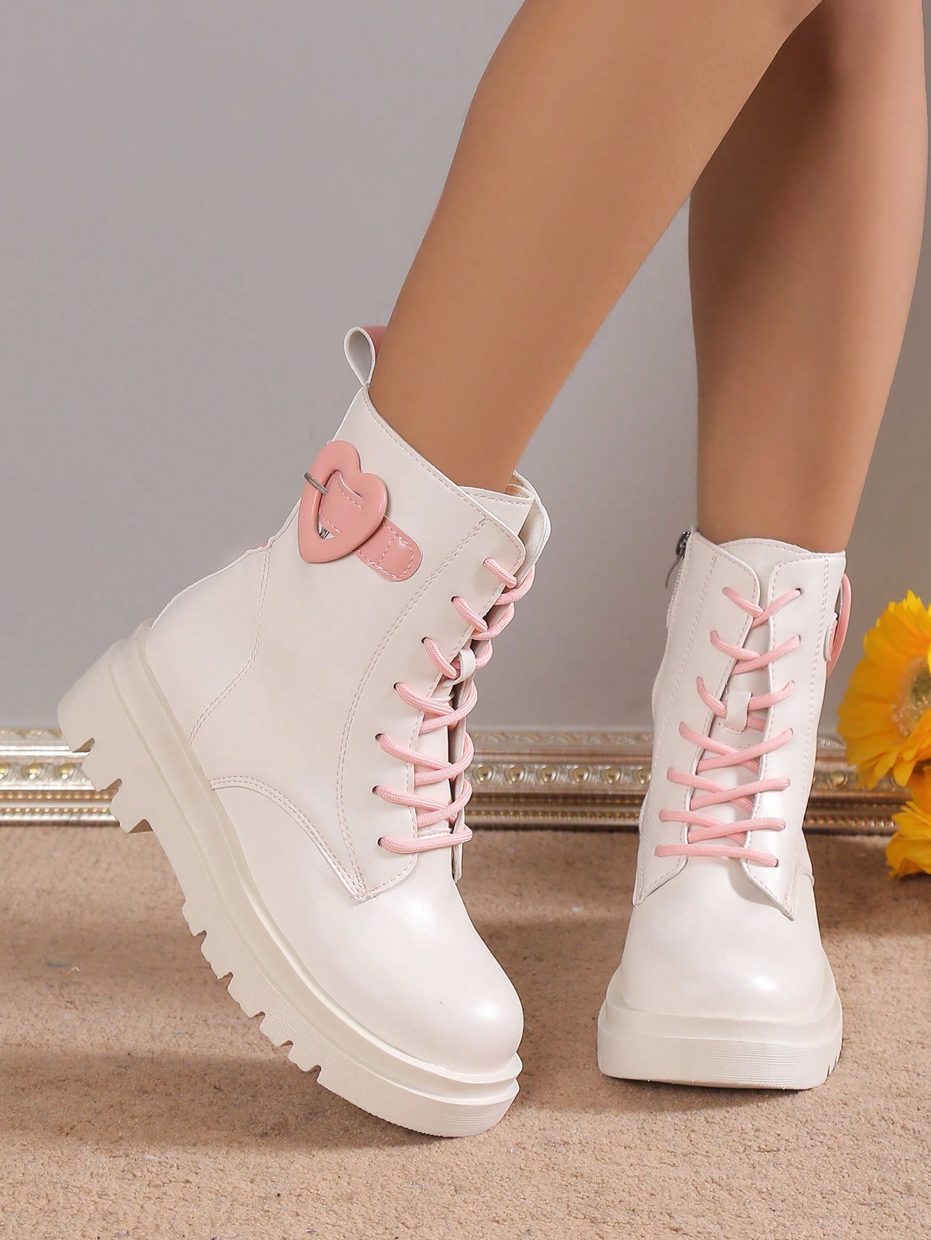 Kawaii Women Heart Decor Lace-up Front Combat Boots, Fashion Outdoor Boots