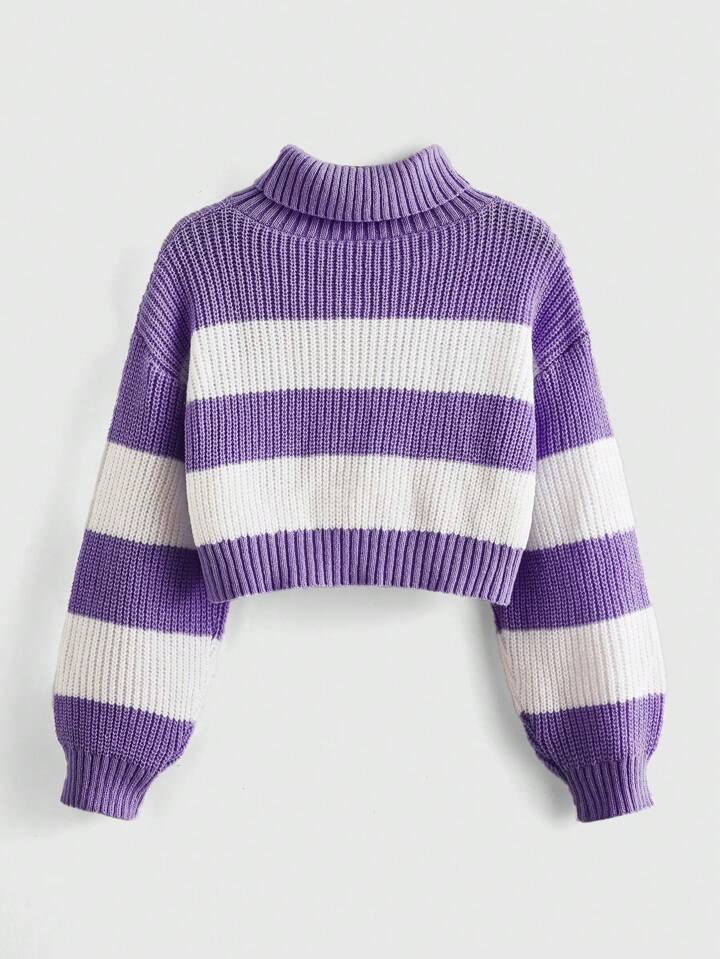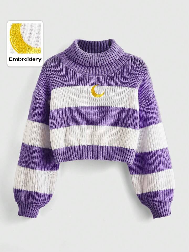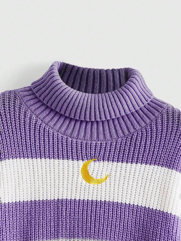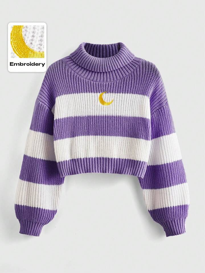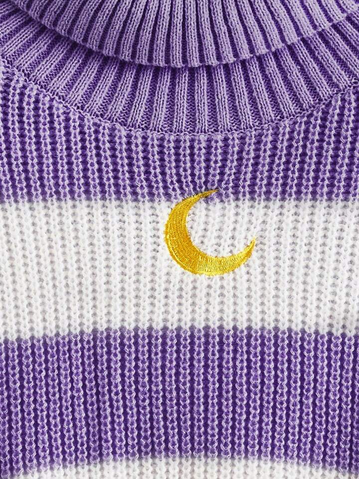 Kawaii Women High Neck Drop Shoulder Long Sleeve Moon Embroidery Colorblock Cropped Knitted Sweater, Autumn/Winter