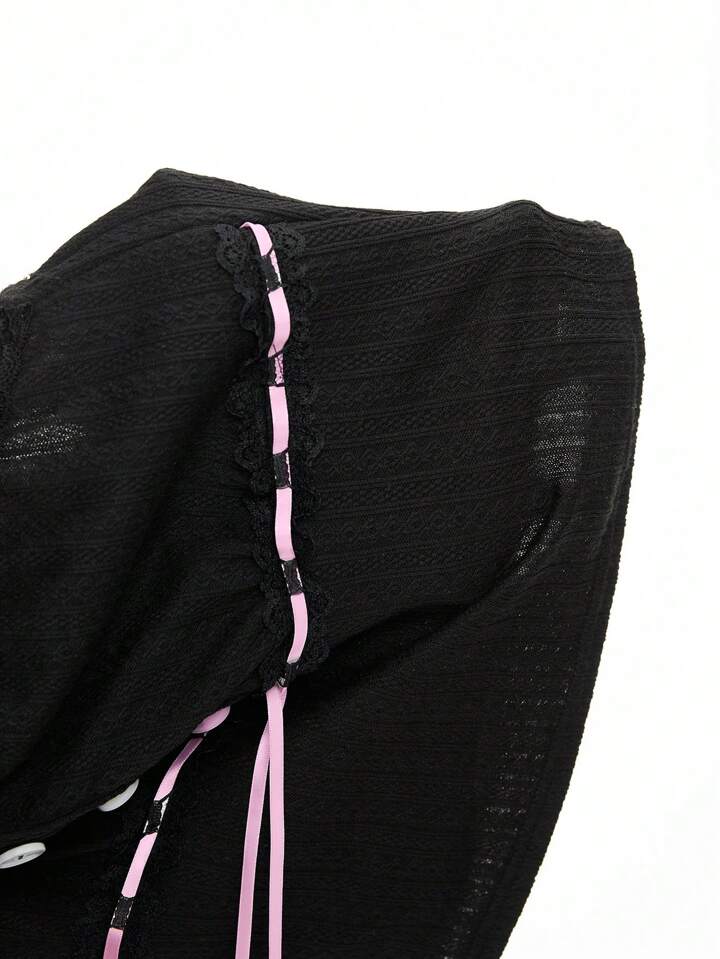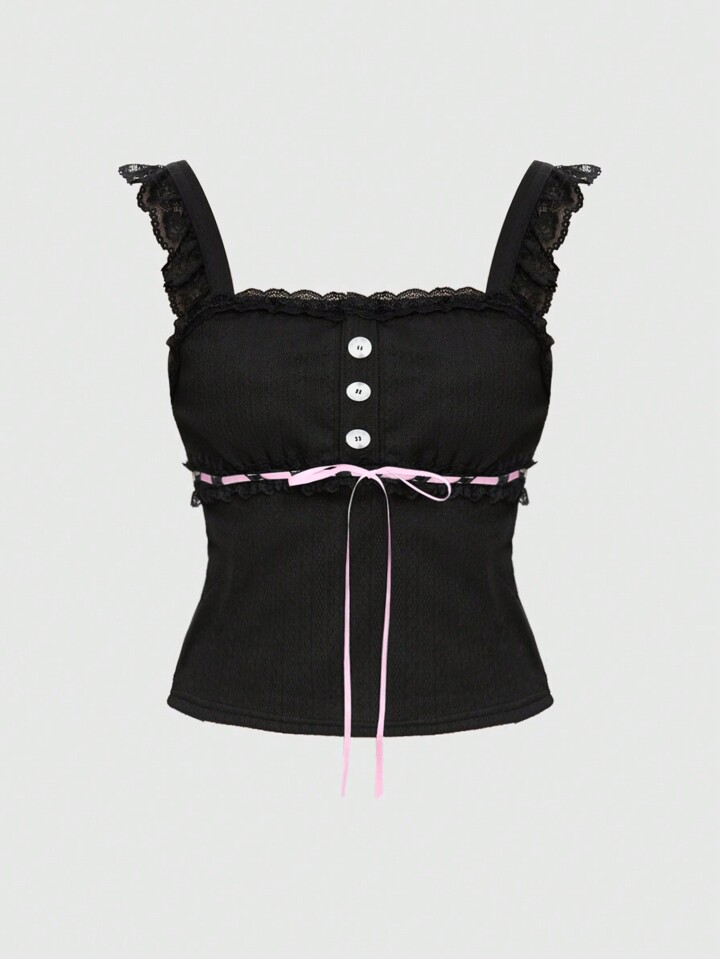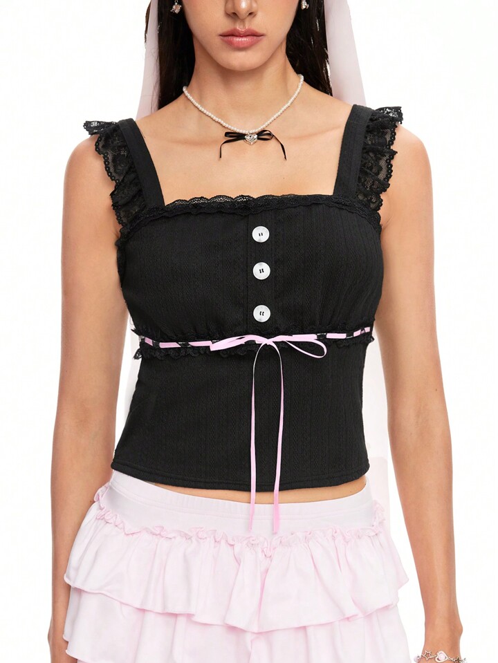 Kawaii Women Lace Trim Sleeveless Black Tank Top With Pink Ribbon Decor, School